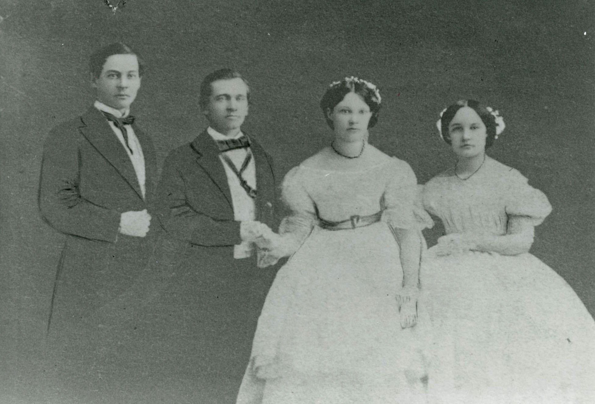 Henry and Georgiana Pittock (center), wedding day, 1860. Robert Pittock and Sarah Abrahams attend..