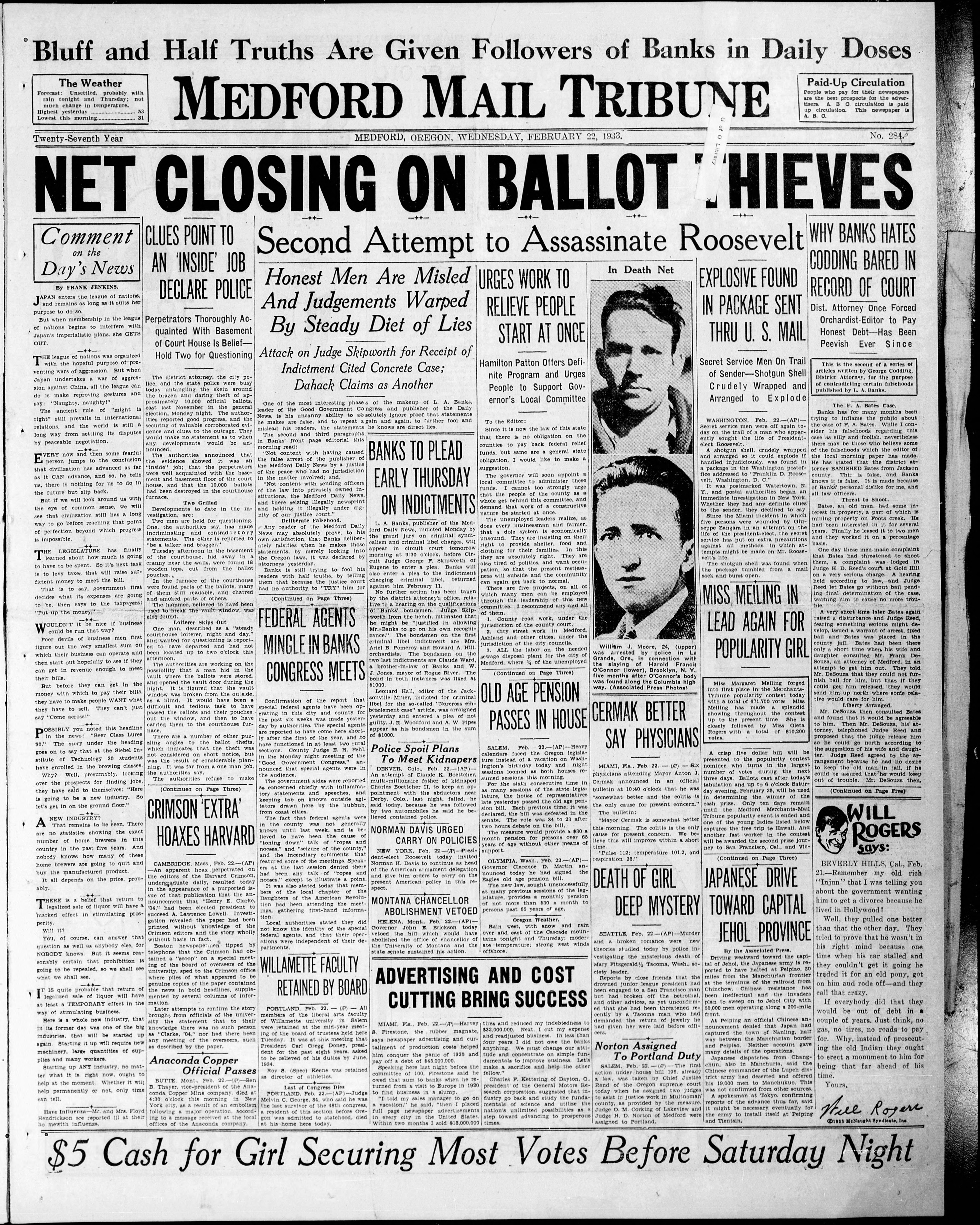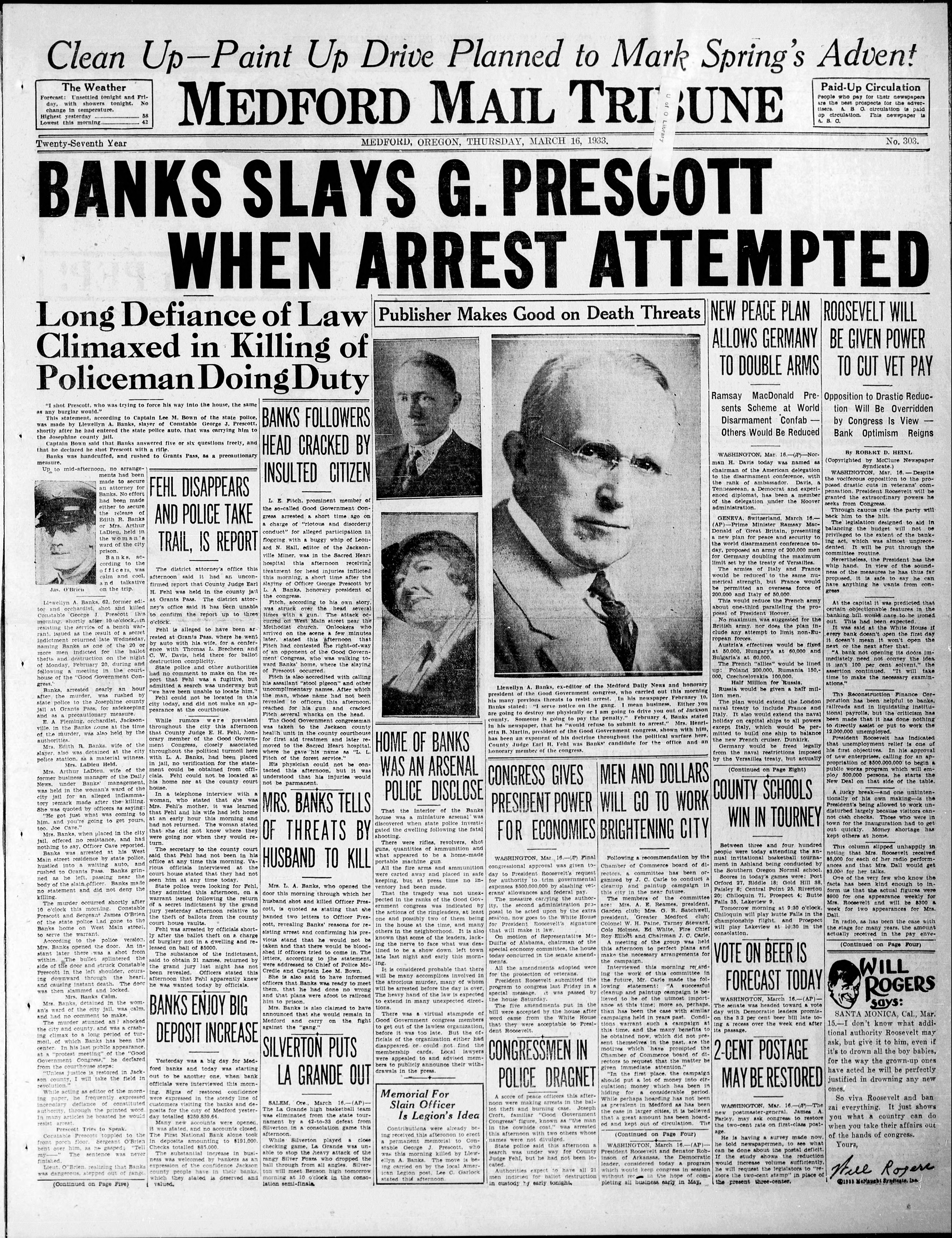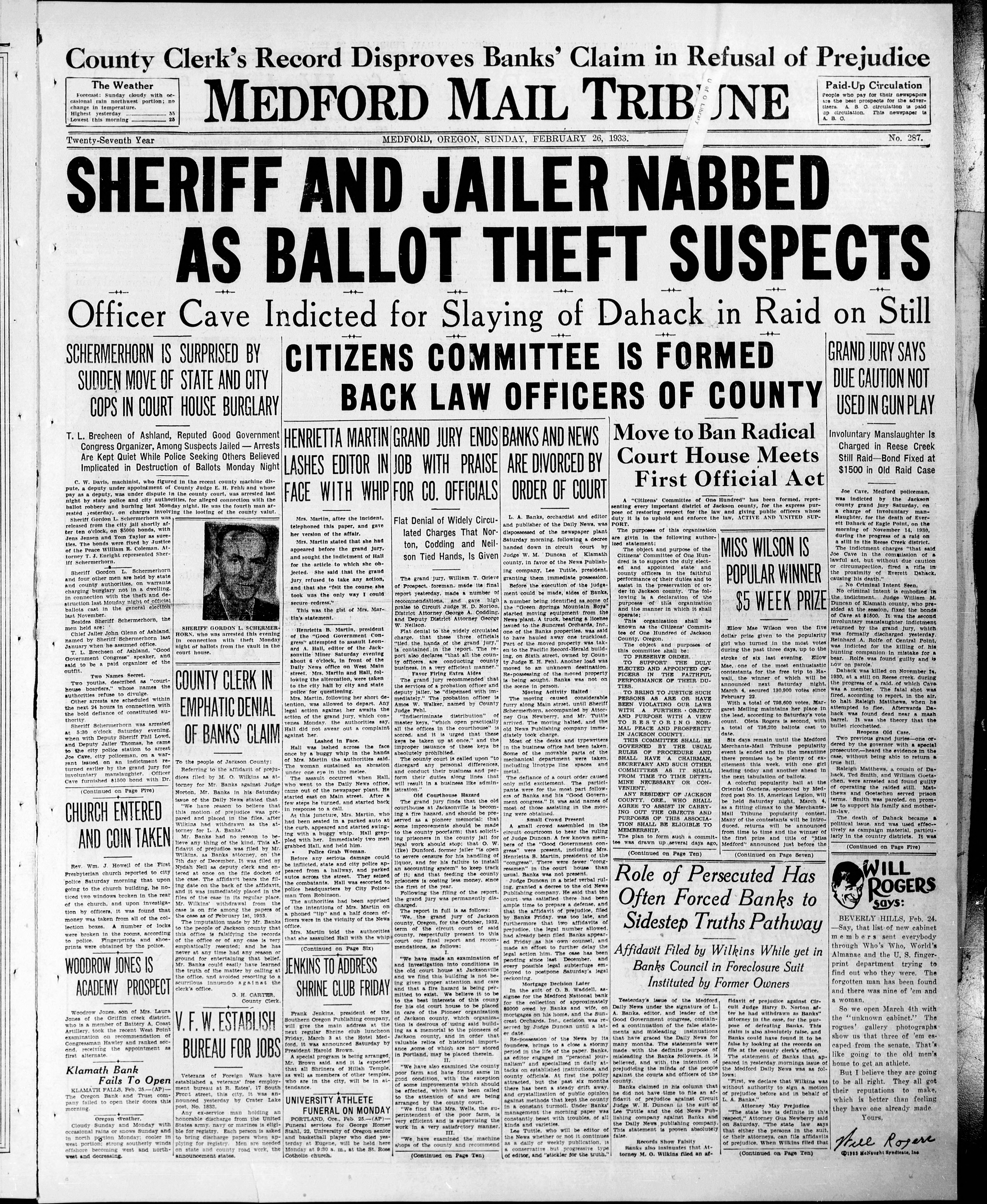 During the severe economic stress of the early 1930s, a homegrown, radical, "populist" political movement that called itself the Good Government Congress briefly took over the reins of Jackson County's government. The GGC, which proved strongest in rural areas and among Medford’s working-class residents, was founded, promoted, and led by Llewellyn A. Banks, a demagogic Medford newspaper publisher and orchardist, and Earl Fehl, a perennially unsuccessful political candidate. After months of agitation and the climactic electoral takeover of the county courthouse, the movement, which gained national notoriety (and a Pulitzer Prize to the Medford Mail Tribune for opposing it), ended spectacularly in ballot fraud, theft, street violence, and murder.