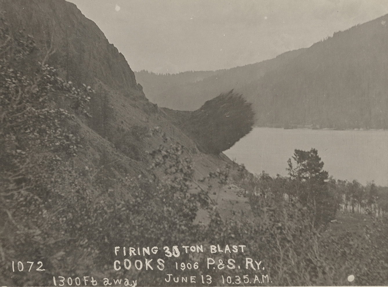 Blasting the cliffs along the Columbia River Gorge to build a railroad, Washington side, 1906.