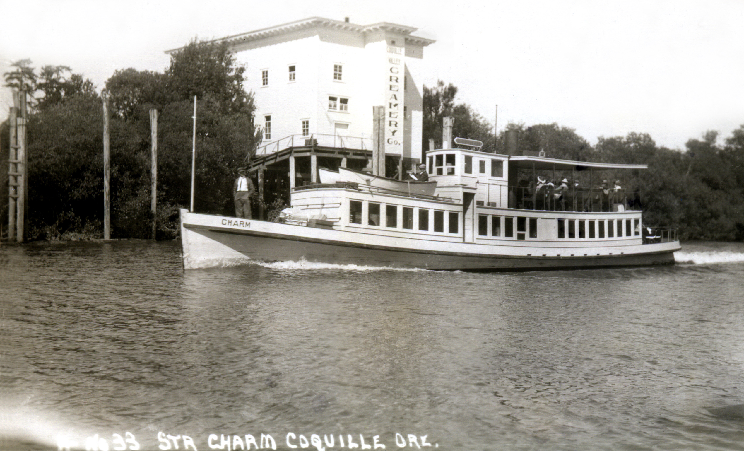 The riverboat Charm, built in 1913, passing the Coquille Valley Creamery west of downtown.