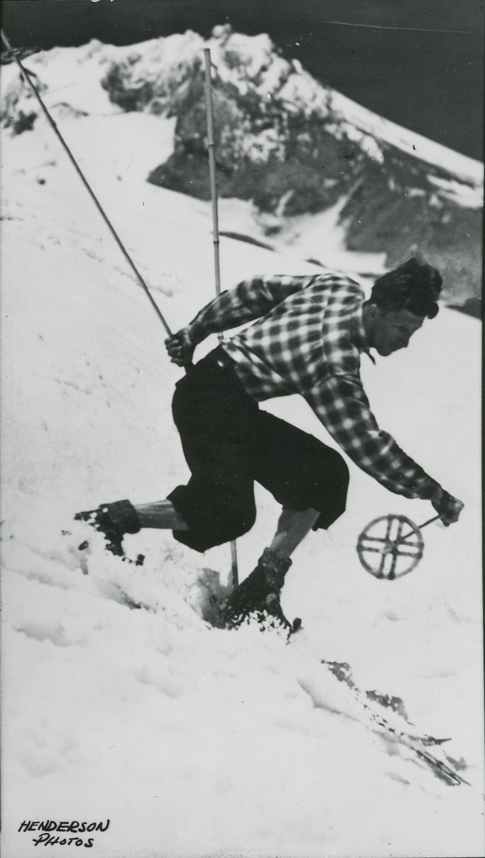During the 1930s, no one in the region could match Hvam’s racing success. He also recorded what may have been the first ski descent of Mount Hood from the summit in 1931. In 1932, he won the cross-country, jumping, and Nordic combined national skiing title at Lake Tahoe. By 1934, Hvam had taken up downhill skiing and had perfected his slalom racing technique, winning his first major race at the Oregon Slalom Championships. Two years later, he won the Silver Skis downhill race on Mount Rainier, one of twelve races he won in 1936-1937, including stunning first-place finishes at the Mount Baker meet in slalom, giant slalom, cross country, and jumping events.
