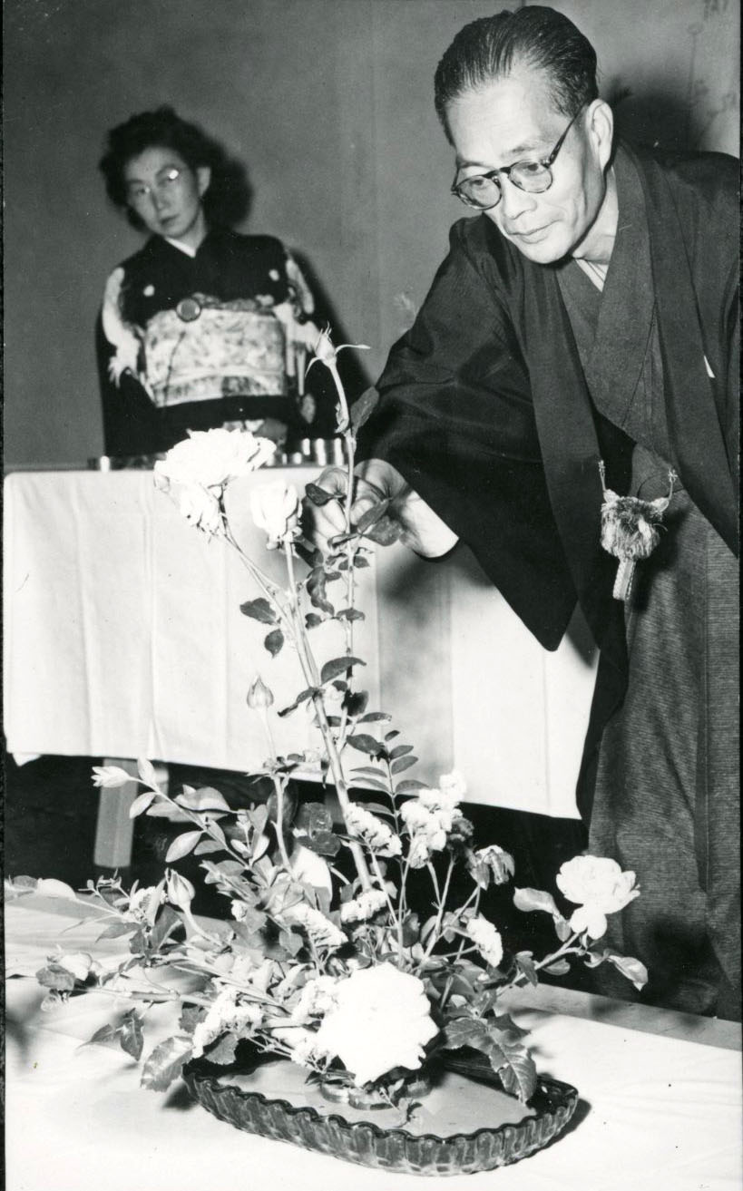 Kikusu Hasegawa holds an Ikebana demonstration using Portland roses, 1951.