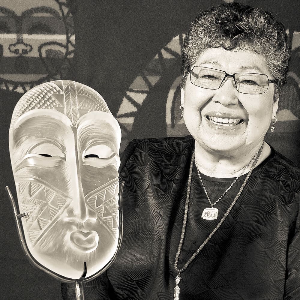 Lillian Pitt (Warm Springs, Wasco, and Yakama) was born on the Warm Springs Reservation in 1944 and moved to Portland in the early 1960s after graduating from Madras High School. When back problems threatened her career as a hairdresser in the 1970s, she began taking art classes at Mount Hood Community College and took up ceramics, initially making masks. Important early artistic influences included the sculptor and painter R.C. Gorman (Navajo) and Japanese mask-making and ceramic traditions.