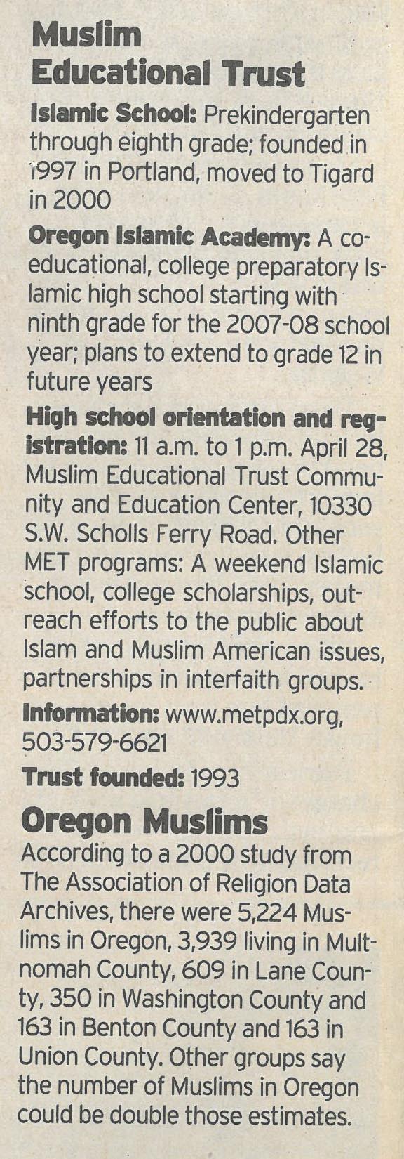 Oregonian feature on the Muslim Educational Trust, April 17, 2007.