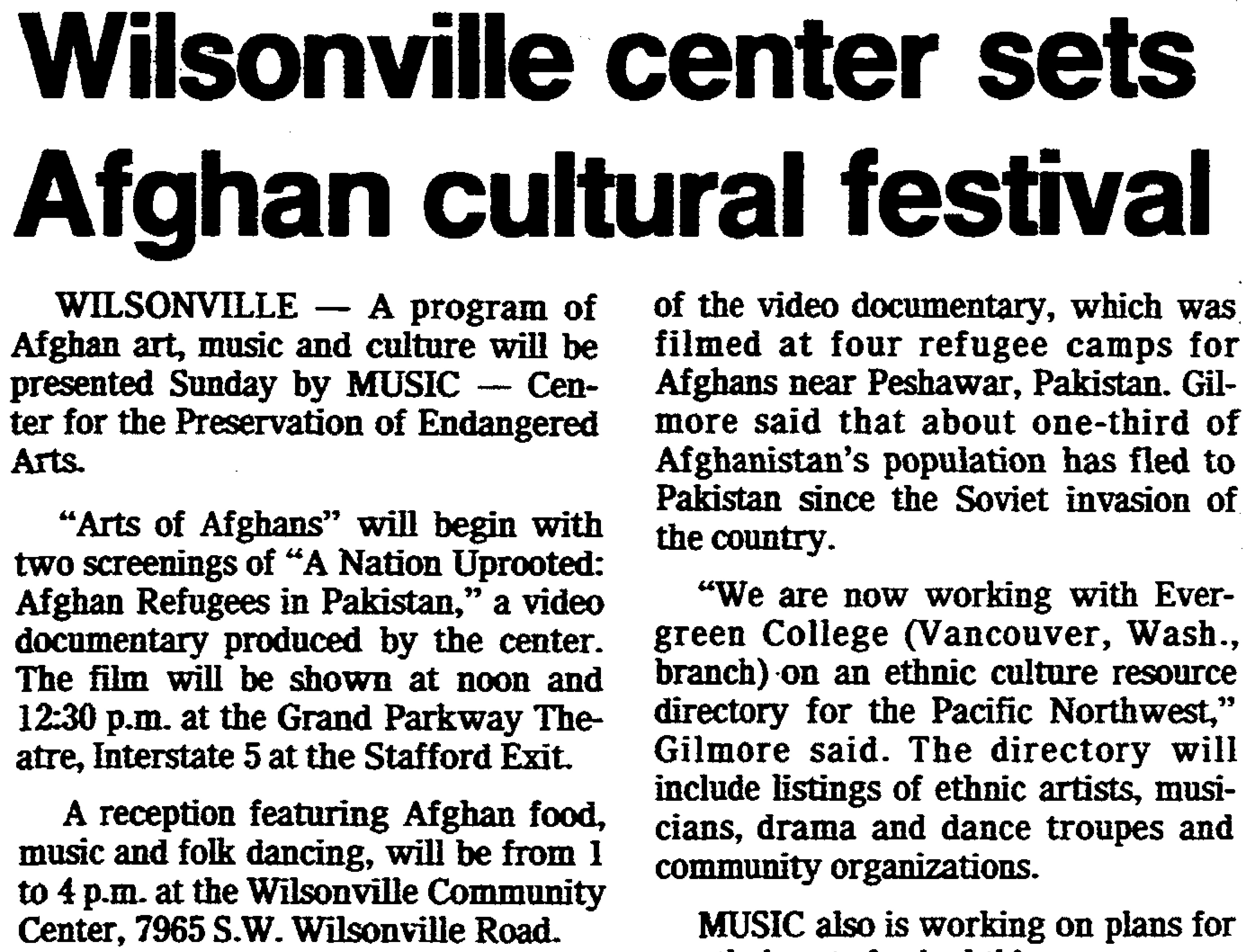 Oregonian article about an Afghan cultural festival in Wilsonville, March 14, 1986.