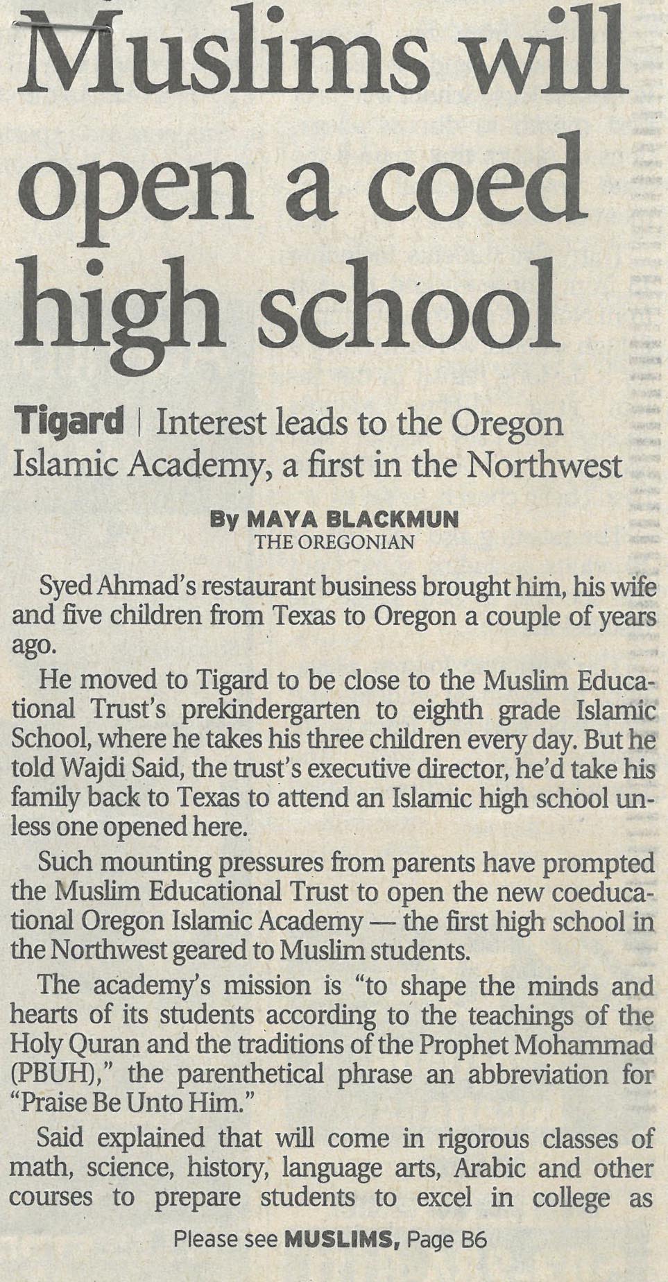 Oregonian article about the Muslim Educational Trust's new Oregon Islamic Academy, April 17, 2007.