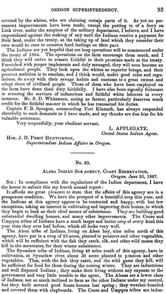 G. W. Collins' June 1867 report on the Alsea Sub-Agency.