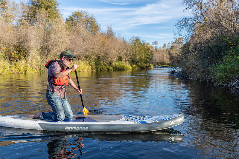 Recreational paddle boarder on the Applegate River at the Provolt Recreation Site, 2019.