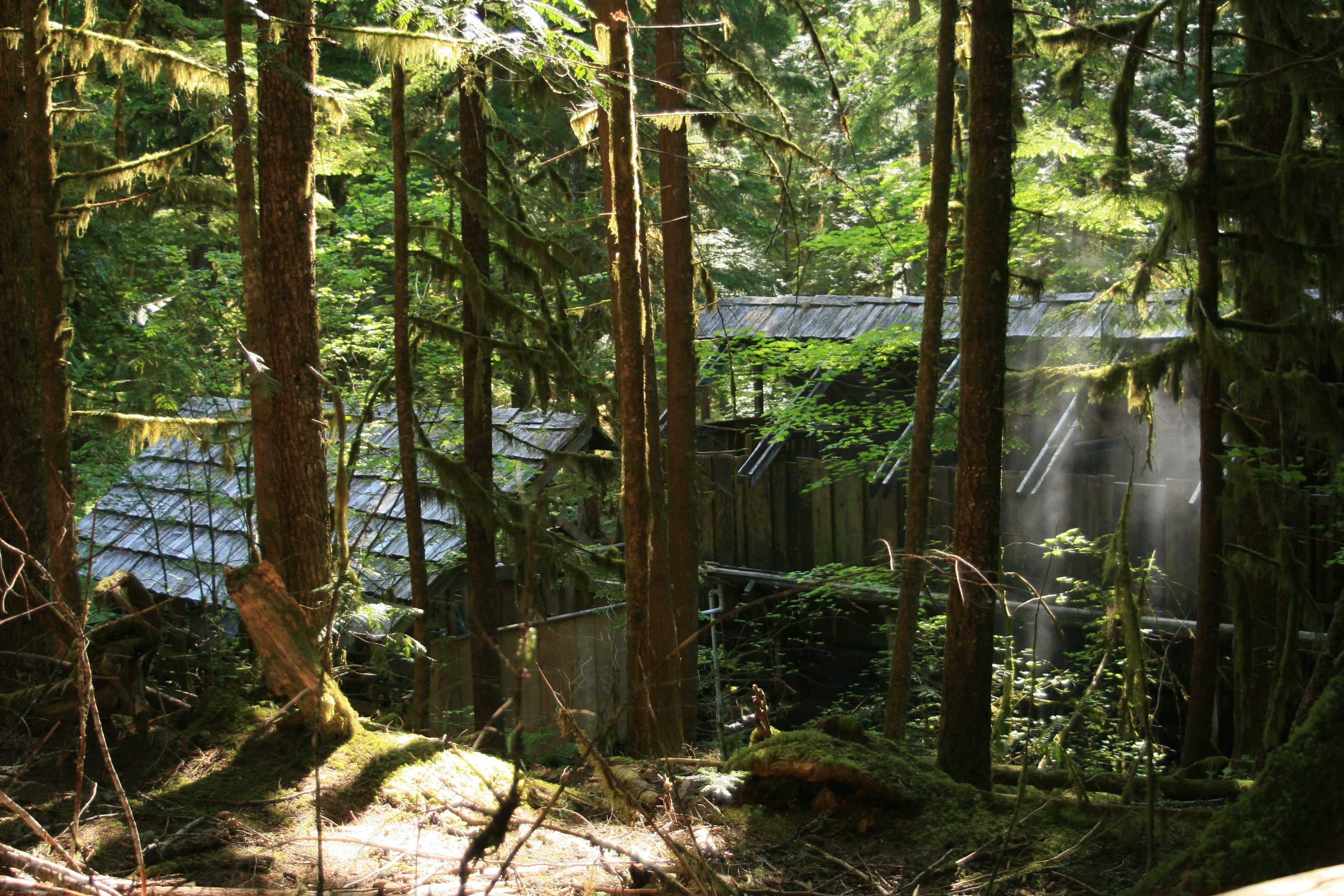 Located along the western edge of the crest of the Cascade Range, Bagby Hot Springs is at an elevation of 2,280 feet. The hot mineral water flows from two underground springs at 25 gallons per minute at about 136 degrees Fahrenheit. Bathers use a system of wooden pipes to fill cedar bathtubs with the steaming water.