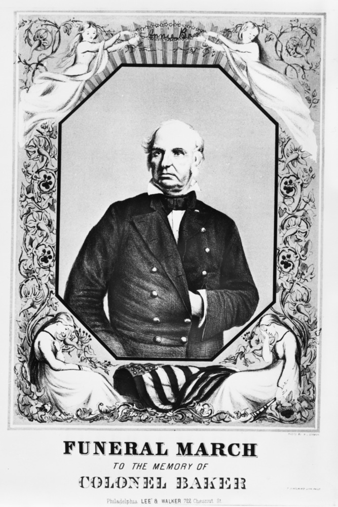 Taking his seat in the U.S. Senate in December 1860, Baker introduced Lincoln at his first inauguration in March 1861. He asked for and received permission to raise and lead a regiment in the war. Baker was killed at the Battle of Ball's Bluff on October 21, 1861, the only member of Congress to die in battle in the Civil War.