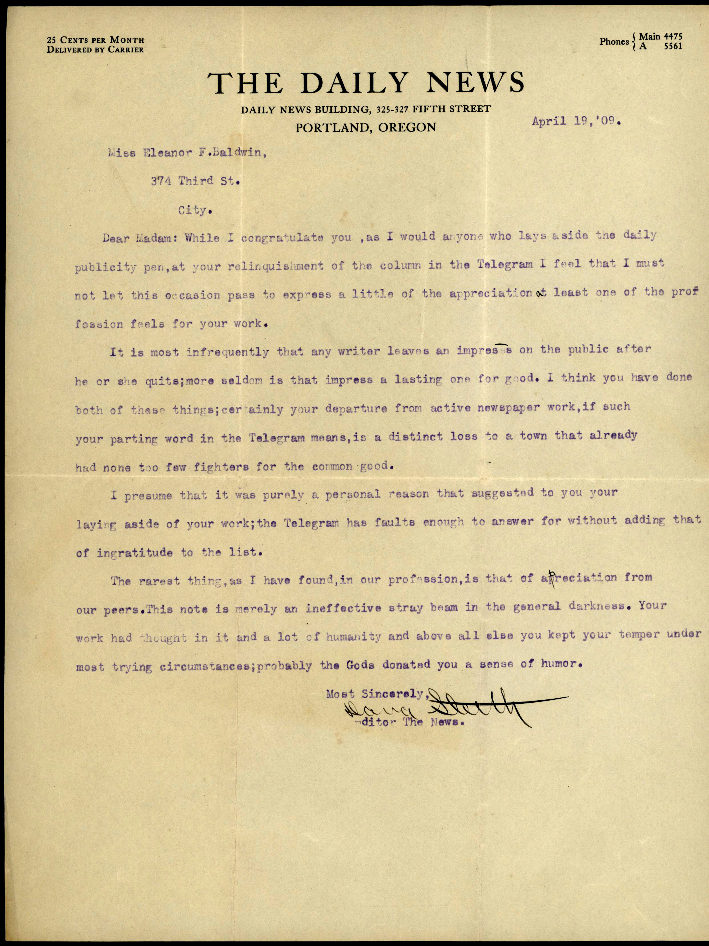 Letter to Baldwin from Portland News editor Dana Smith on the loss of Baldwin's column, April 19, 1909.
