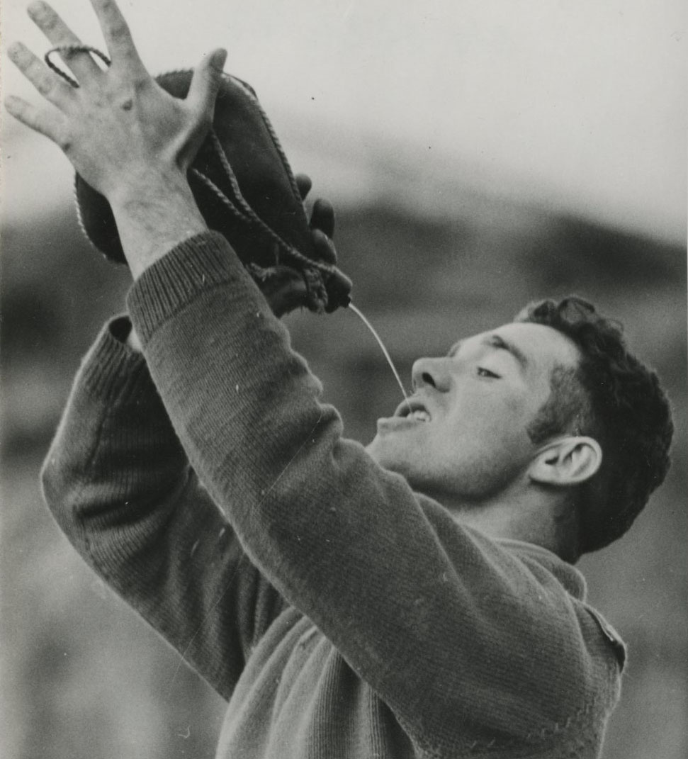 Domino Egana, Basque sheepherder in Jordan Valley, drinking from a Datskin pouch, 1966.