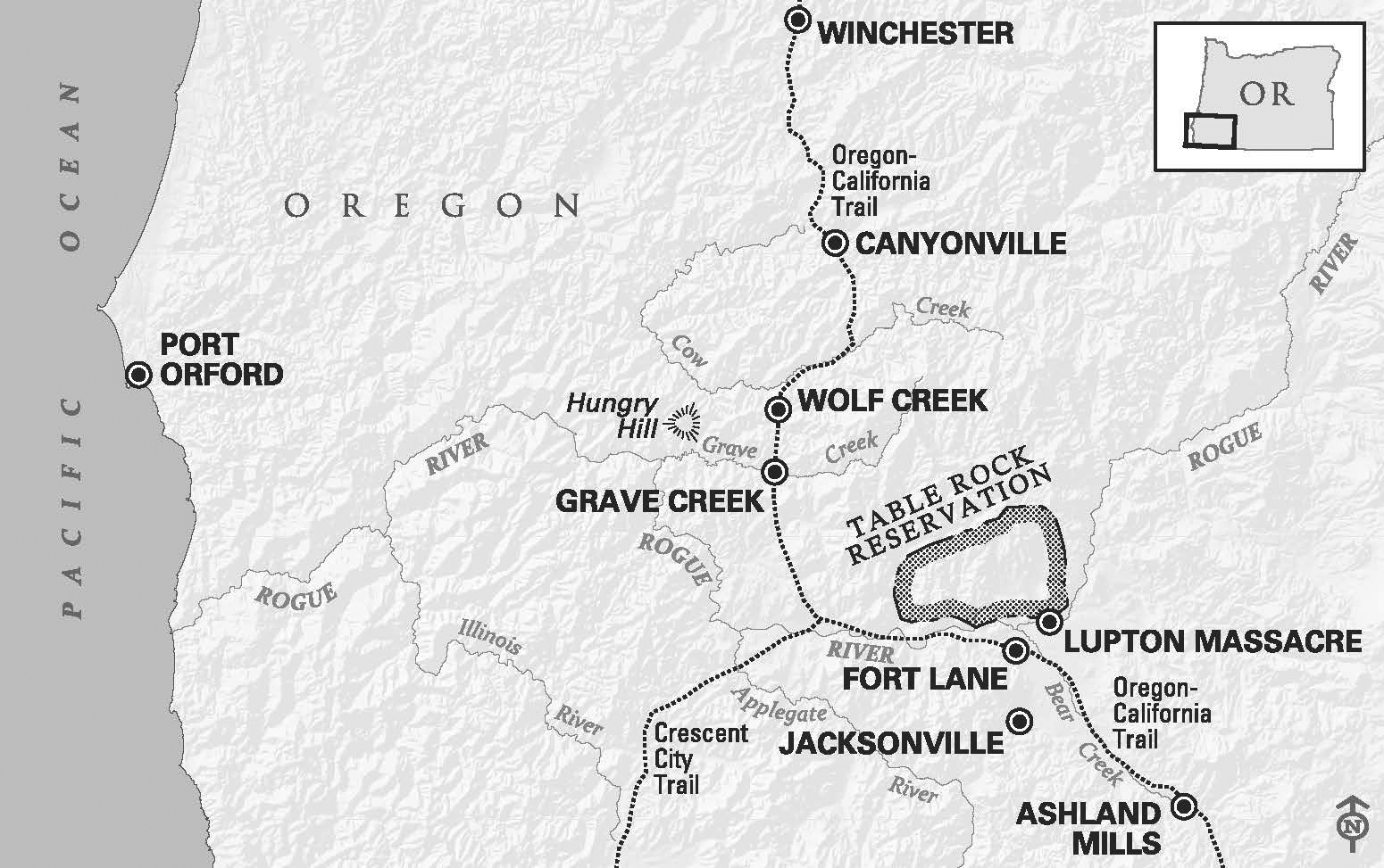 A map of Southern Oregon in 1850, marking (among other places) Hungry Hill, the site of the Lupton Massacre, Fort Lane, and the Table Rock Reservation..