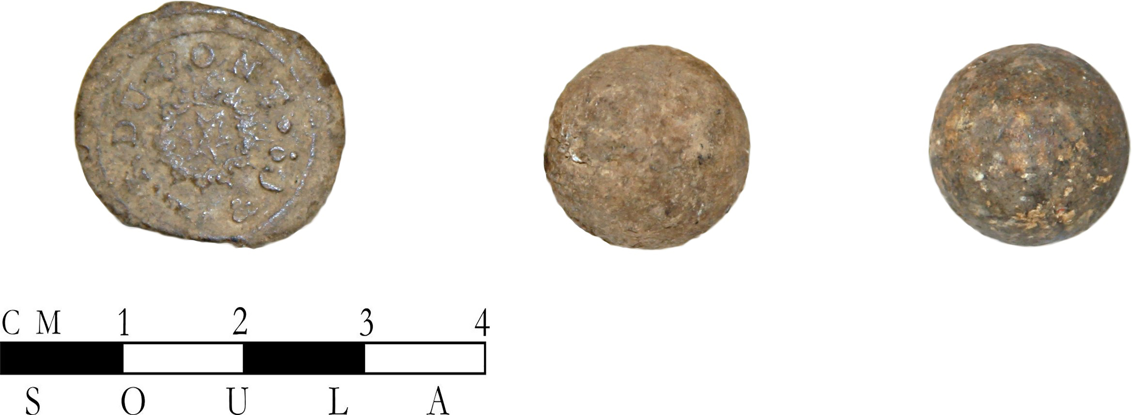 A gun powder container stopper and two .69 caliber lead musket balls found at the Hungry Hill Battle site..