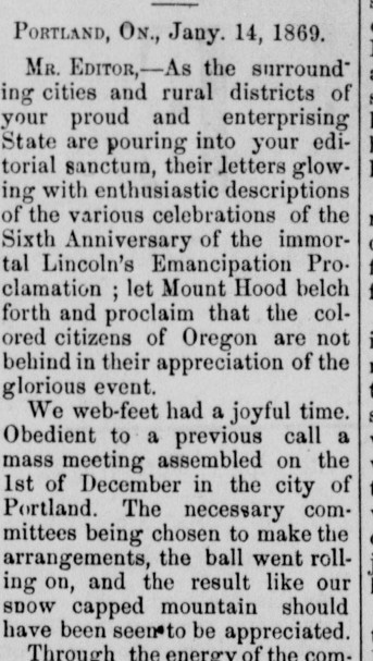 “Celebration in Portland. Ratification Jubilee.” Forwarded by Mark Bell from the Oregonian, April 7, 1870. San Francisco Elevator, April 22, 1870, p. 1.