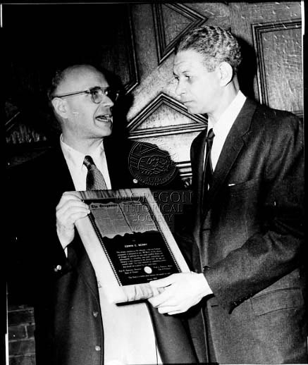 U.S. Senator, Richard Neuberger presents plaque to Bill Berry in appreciation of his service with the Urban League, 1956.