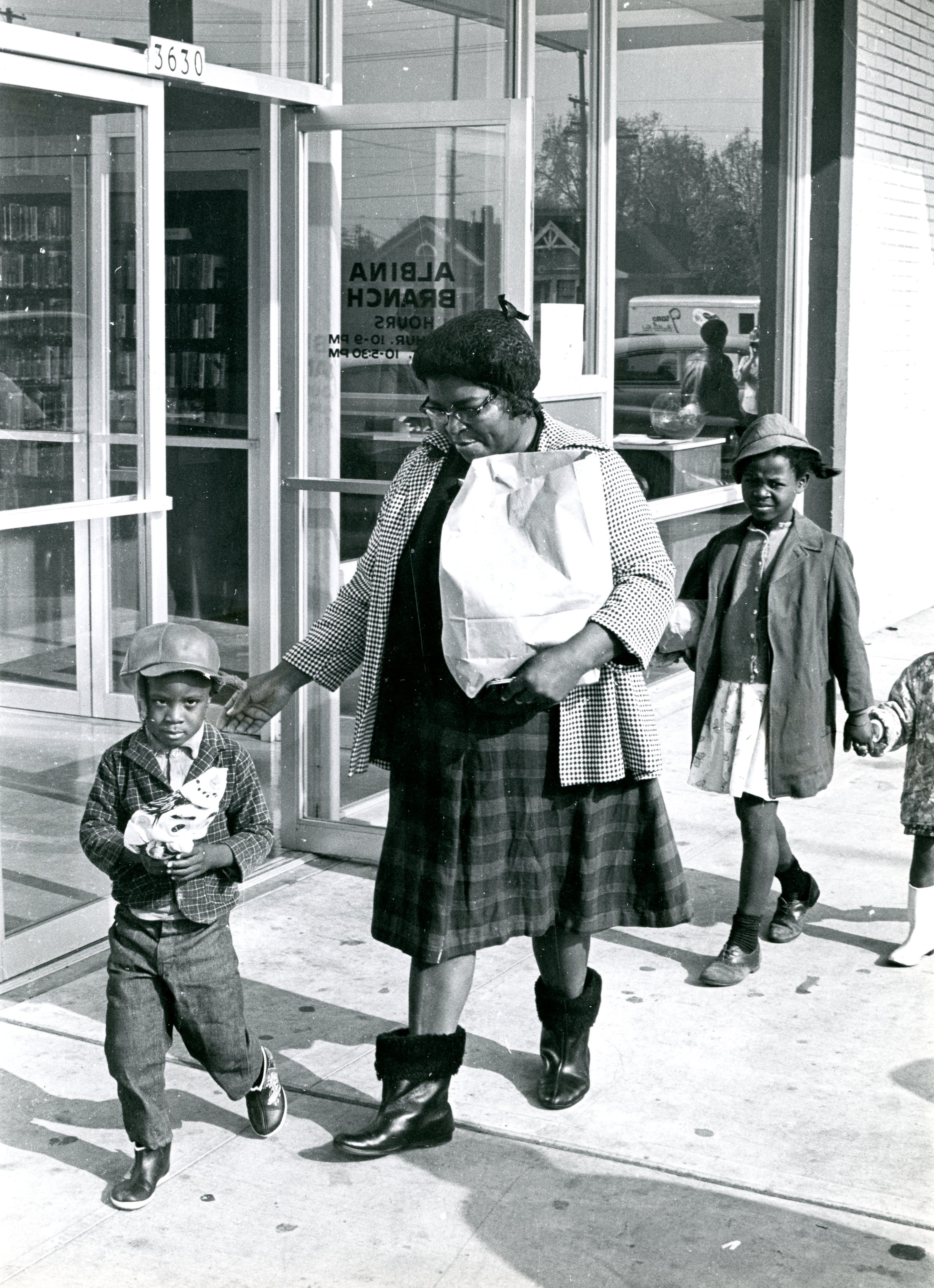 A family walks by the Albina branch of the Multnomah County Public Library, Portland, November 1968.