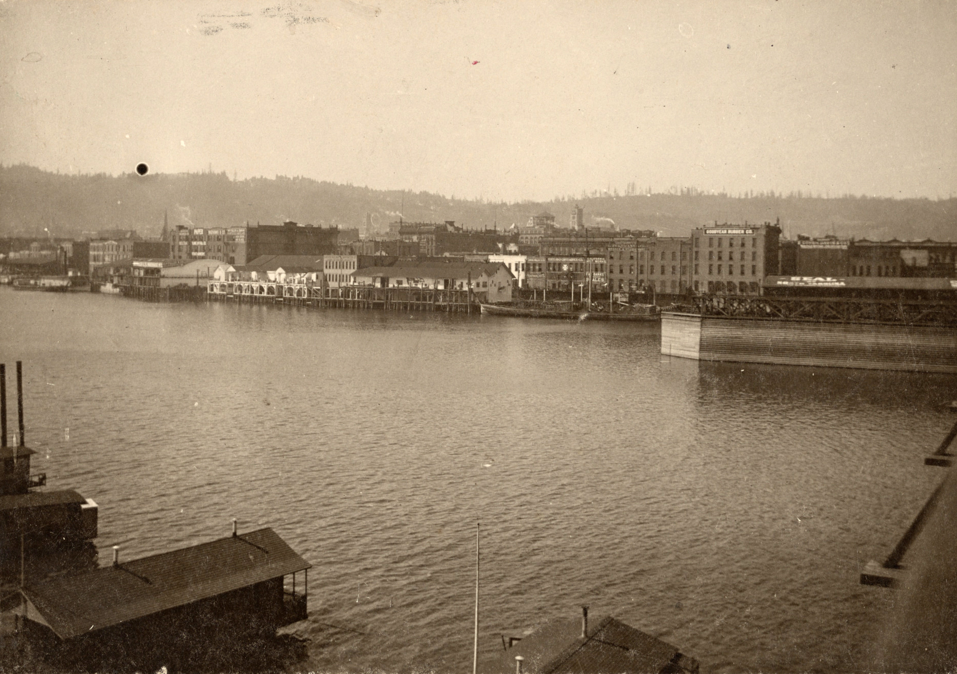Portland waterfront, south of Morrison Bridge, looking west, 1895.