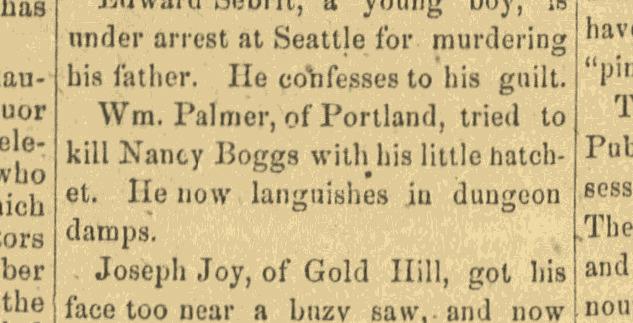 Much of what we know about Boggs comes from local newspapers and directories, which document some of the typical socioeconomic obstacles faced by lower-class women at the time. By 1860, Boggs was working as a “domestic,” living with her daughter at the Howard House, a hotel operated by James W. Going at 5 North Front Street. Nine years later, she was operating a Stamp Store on First Street. The next year, the Morning Oregonian reported that she had been convicted of larceny but acquitted on appeal. In 1870, Boggs reportedly sued a faithless lover, saloonkeeper Ira Morrill, for “breach of promise” and was awarded $15 in damages. She also sued the local dogcatcher, Charles Lawrence, in 1873, charging him with seducing her daughter; the charges were dropped. Then, in 1874, the Oregonian reported that "William Palmer of Portland, tried to kill Nancy Boggs with his little hatchet. He now languishes in dungeon damps."