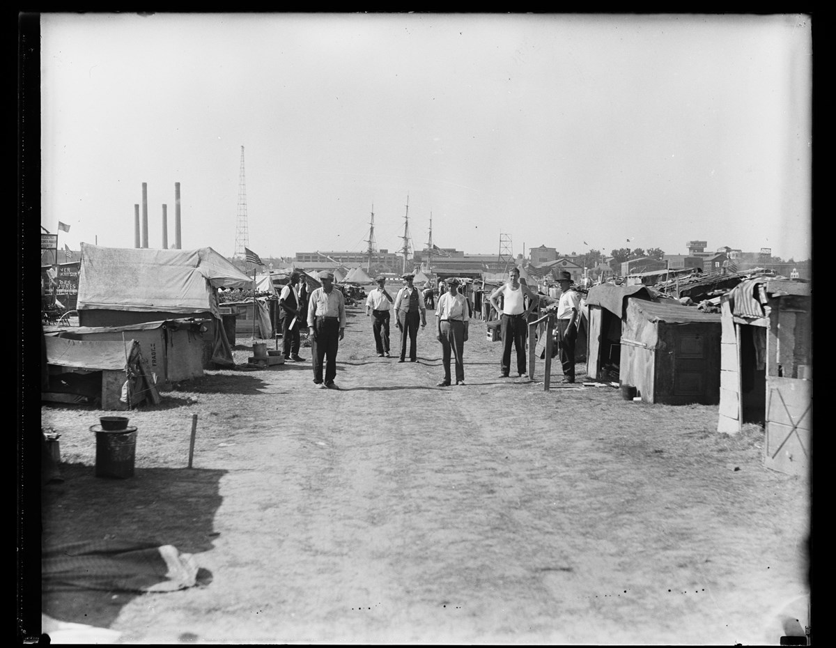 In 1932, with the Northwest lumber industry hit especially hard by the Depression and with “Hoovervilles” springing up in the city’s Sullivan Gulch and elsewhere, Portland became a center of activity for a direct-action political movement known as the Bonus Army. By late 1931, thousands of unemployed World War I veterans across the country had begun to call on Congress to pay their long-promised enlistment bonus ten years early (it was not due until 1942). In the opening months of 1932, Portland veterans became increasingly vocal, some of them calling for a veterans’ march on Washington, D.C.