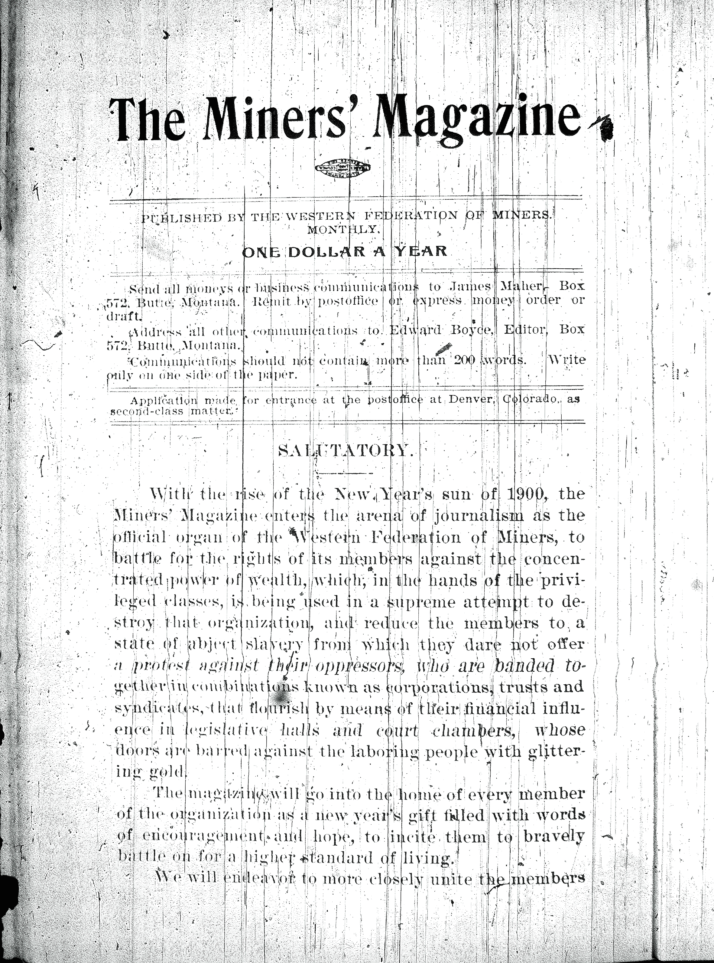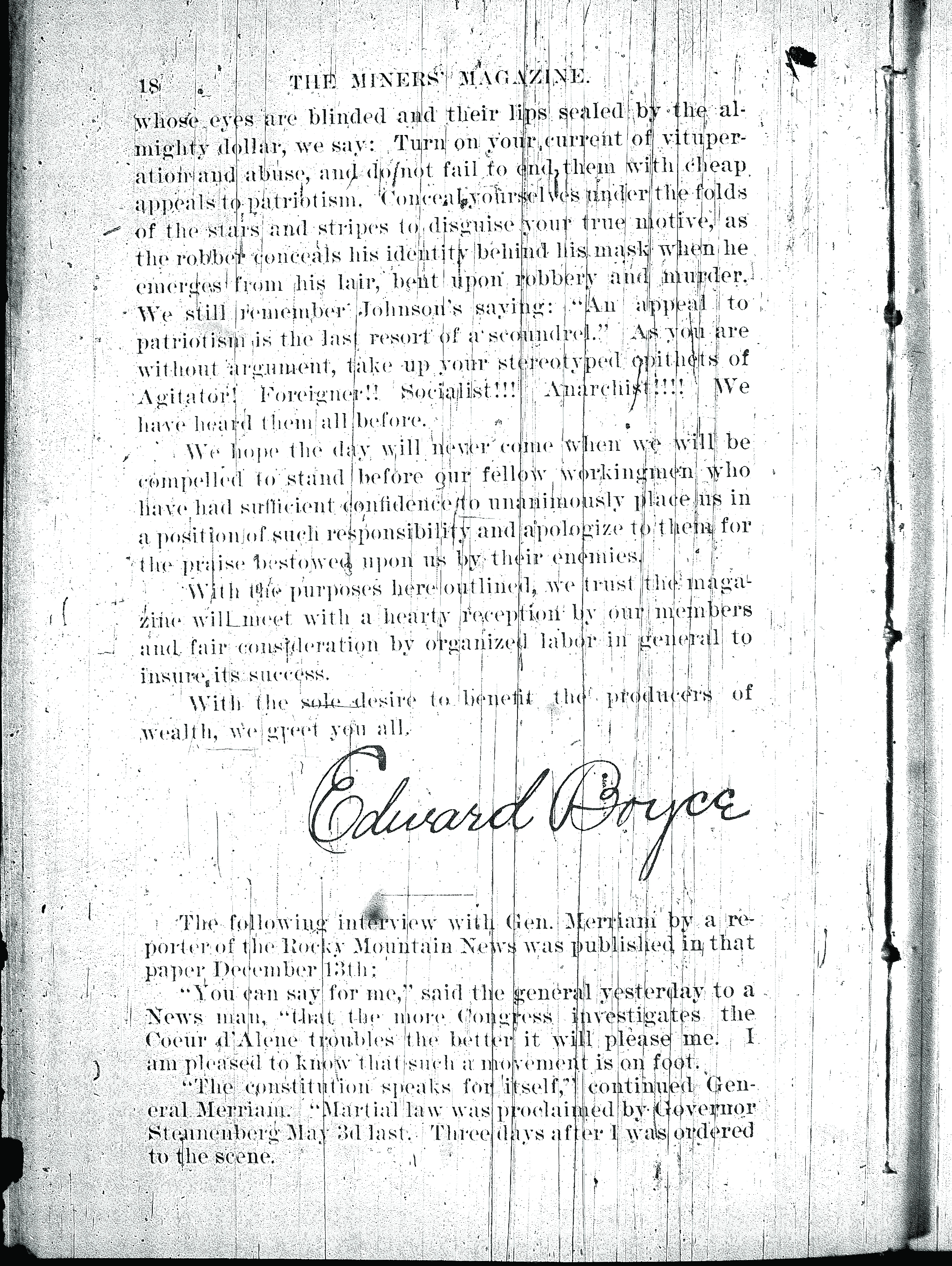 Born on November 8, 1862, in County Donegal, Ireland, Boyce made his way to the United States as a young man. By the early 1890s, he was working as a hard-rock miner in the Northern Rockies, and he was soon involved in attempts to organize miners to gain better pay and working conditions. In 1892, authorities detained Boyce and over a dozen other miners in a Boise, Idaho, jail. After their release, some of the men formed a core of workers who met in Butte, Montana, to charter the Western Federation of Miners (WFM). From its beginnings in 1893 until about World War I, the WFM was at the vanguard of radical labor unions in the United States.