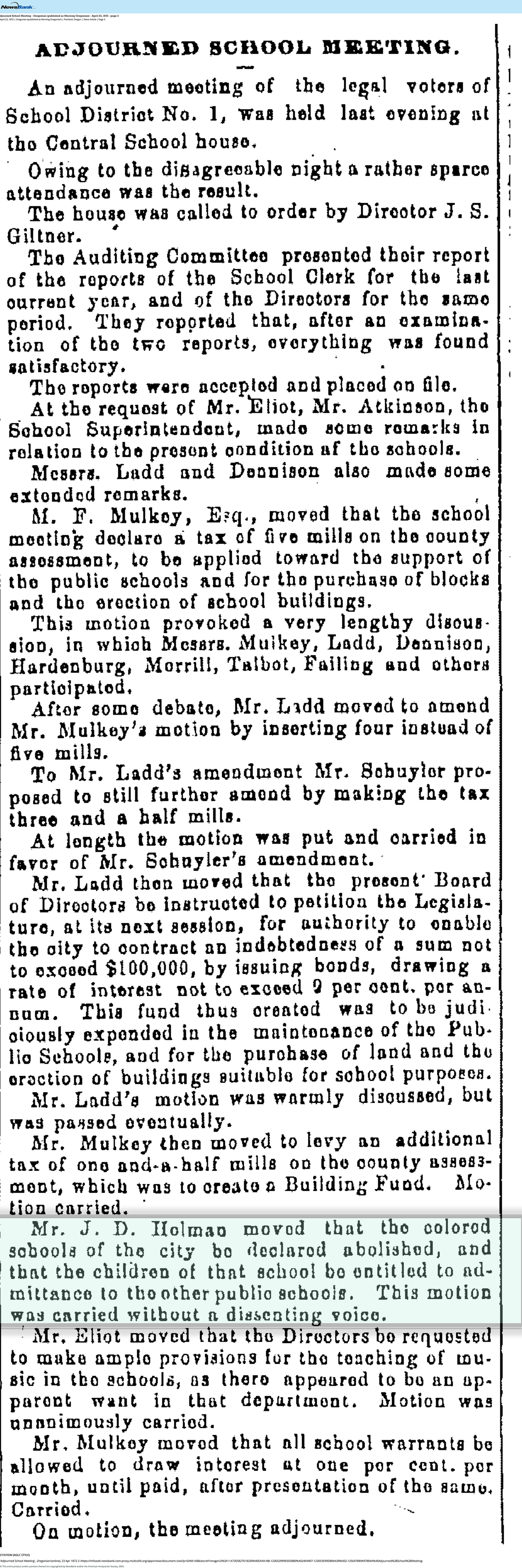 "Adjourned School Meeting." Oregonian, April 23, 1872, p.3.