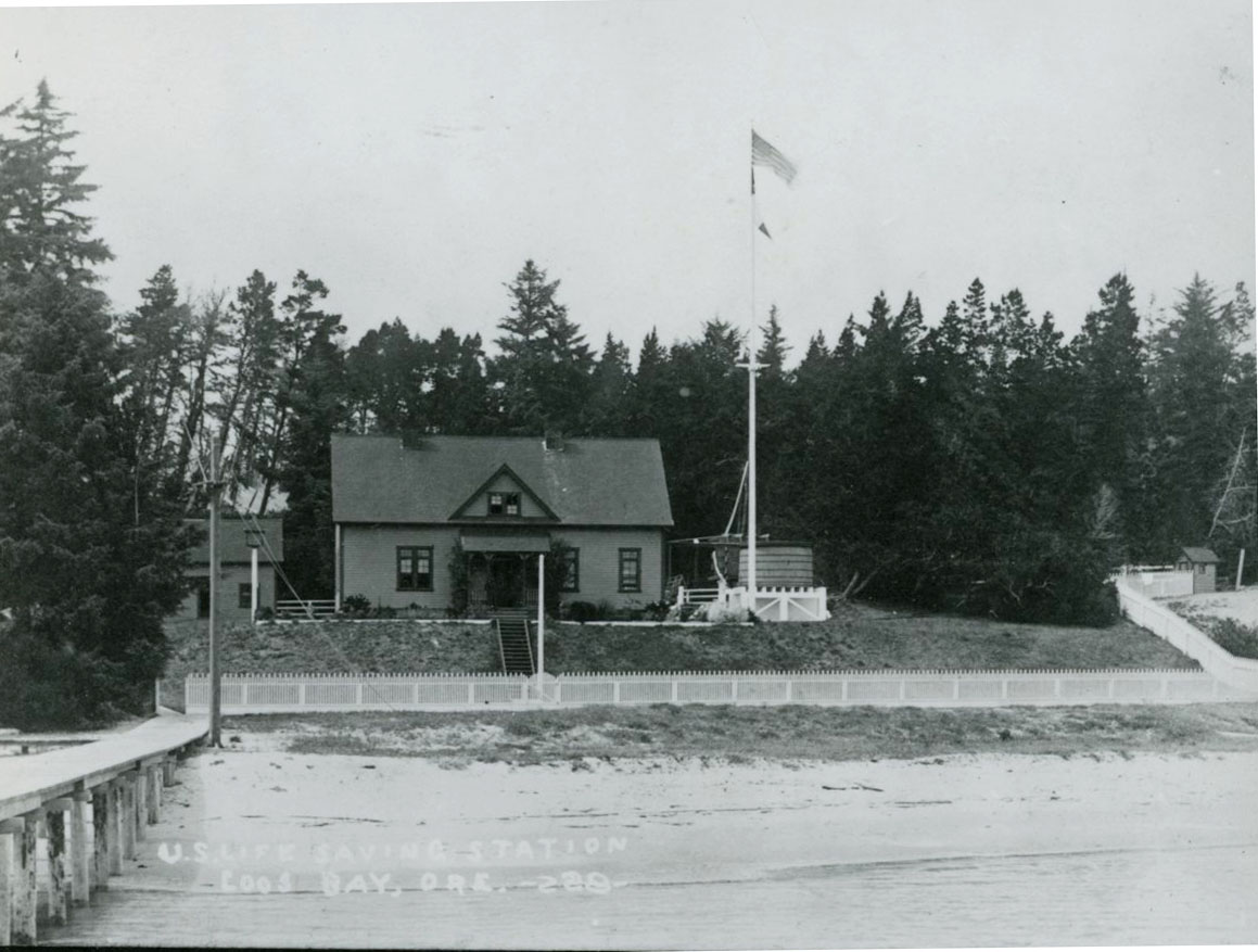 The U.S. Lighthouse Board built the first life-saving station in Oregon on the island in 1878. The station was moved to the mainland in 1891, but fog continued to be a menace to commerce in and out of Coos Bay. In 1893, the Lighthouse Board requested the use of $15,000, left over from the construction of a lighthouse on the Coquille River, to build a fog signal and reconstruct the keepers’ quarters. Although hampered by difficulties in landing supplies and the wreck of a schooner carrying materials, the fog signal and new keepers’ quarters were completed in May 1896.
