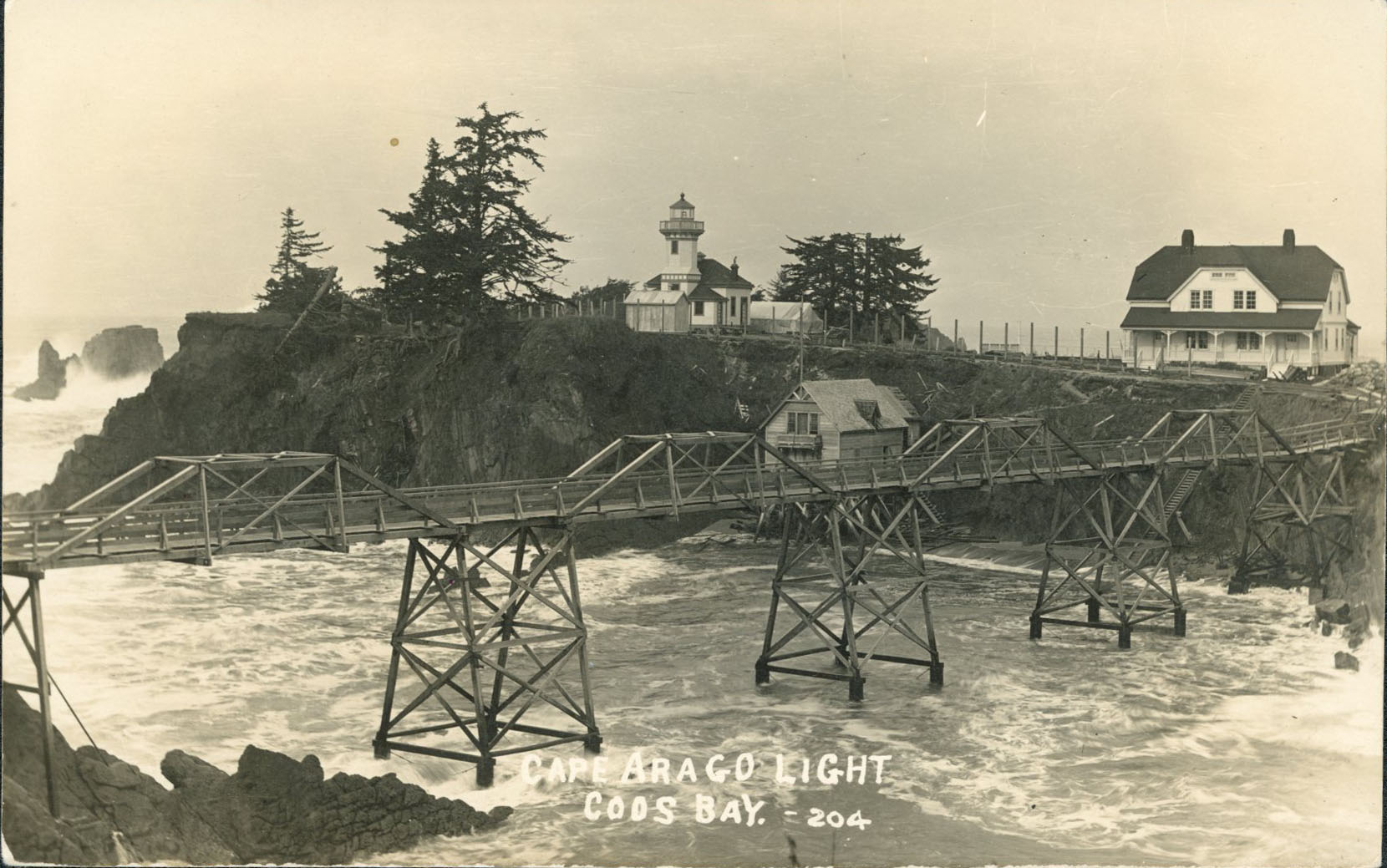 Cape Arago Lighthouse is on Chiefs (or Chief’s) Island, named by the Coos, whose homelands include the headland across from the island. EuroAmerican residents who arrived during the nineteenth century saw the island in a different way. As the town of Coos Bay grew in commercial importance through the 1860s, community and business leaders decided that a lighthouse was imperative to guide mariners over the treacherous Coos Bay bar. With a $15,000 appropriation from Congress, approved in July 1864, the lighthouse was built at the northern tip of Lighthouse Island, as non-Natives came to call it, with the keepers’ quarters at the southern end. The skeletal octagonal tower—25 feet high and supported on stilts—was enclosed in sheet iron, with the lantern room perched above. The keeper’s dwelling was linked to the tower by a 1,300-foot-long wooden walkway. The first head keeper, Leonard Hall, lit the light on November 1, 1866.