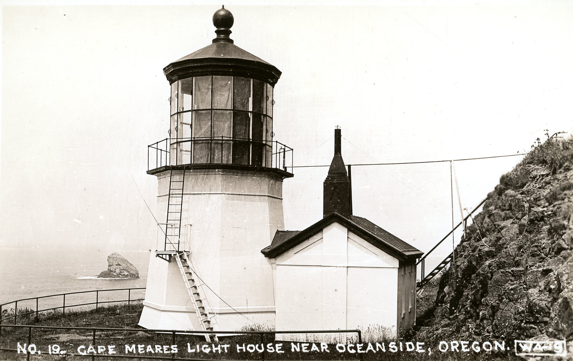 Cape Meares Lighthouse is located atop Cape Meares, a scenic craggy headland about ten miles southwest of Tillamook Bay, where sheer cliffs drop some three hundred feet to the waters below. Both the lighthouse and the headland are named for British explorer and fur trader John Meares, who sailed along the Northwest Coast in 1788.