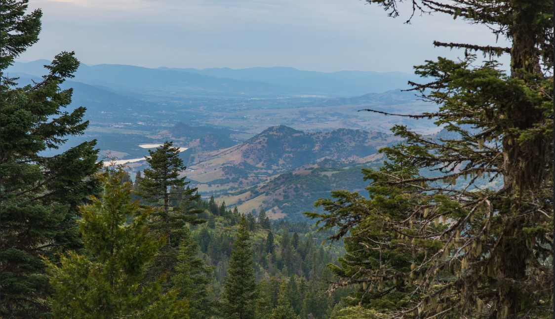 Westerly view from Hobart Bluff in the southern Cascade Range showing the Siskiyou Mountains and Bear Creek Valley in the distance.