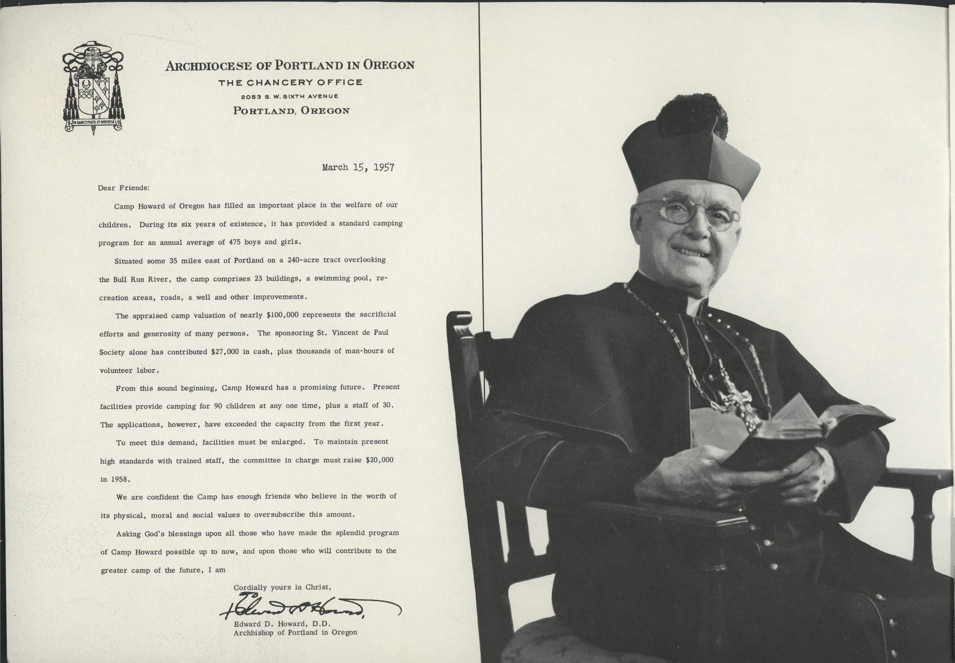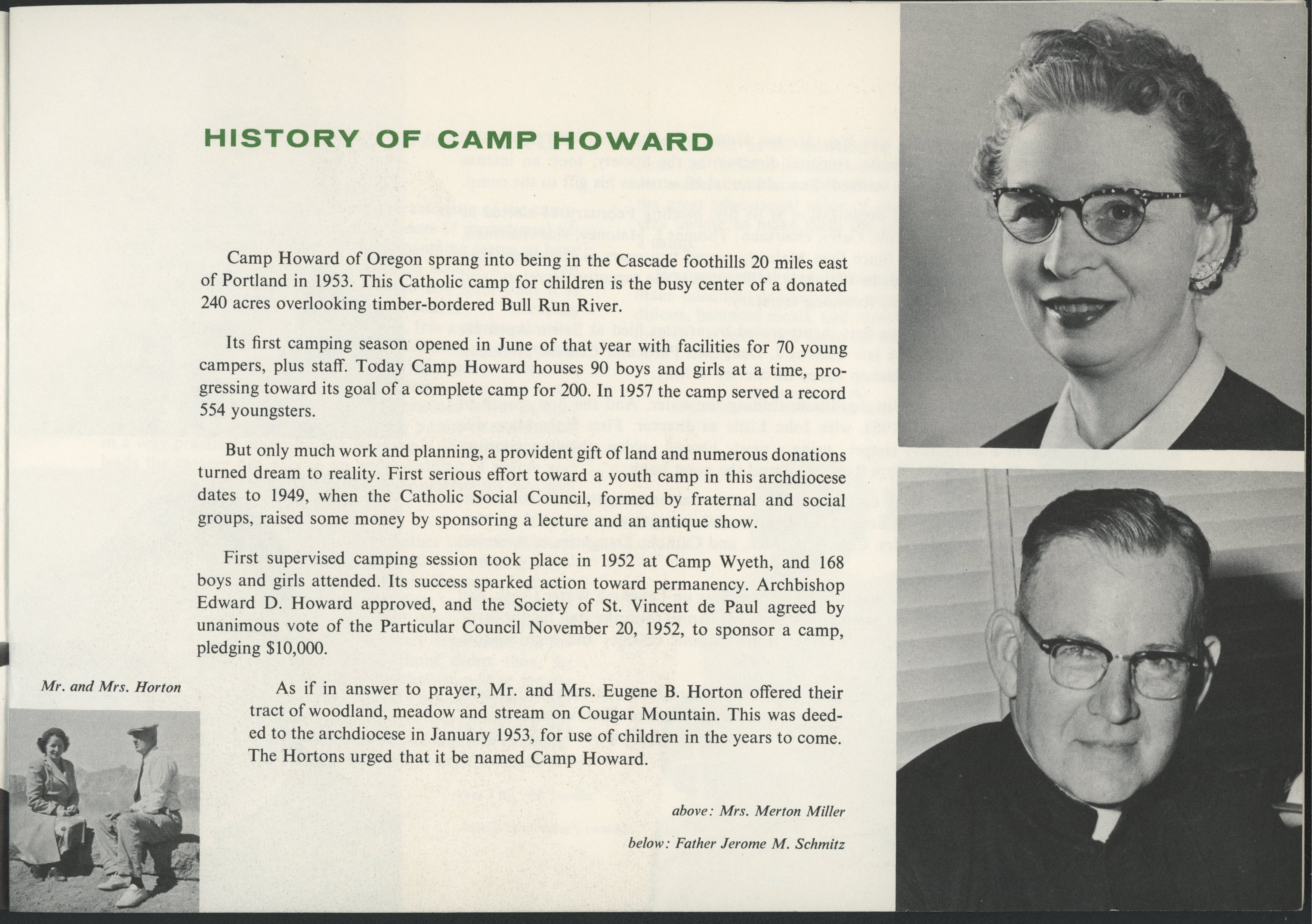 One of Catholic Charities’ most prominent and widely used programs was founded in 1952. Mr. and Mrs. E.B. Horton donated 160 acres of wooded land on Cougar Mountain near Corbett for summer sports and camp programs for Catholic youth in the area. Two years later, an additional 80 acres was purchased for the camp, named Camp Howard. At its first summer of operations in 1953, the camp served 378 children.