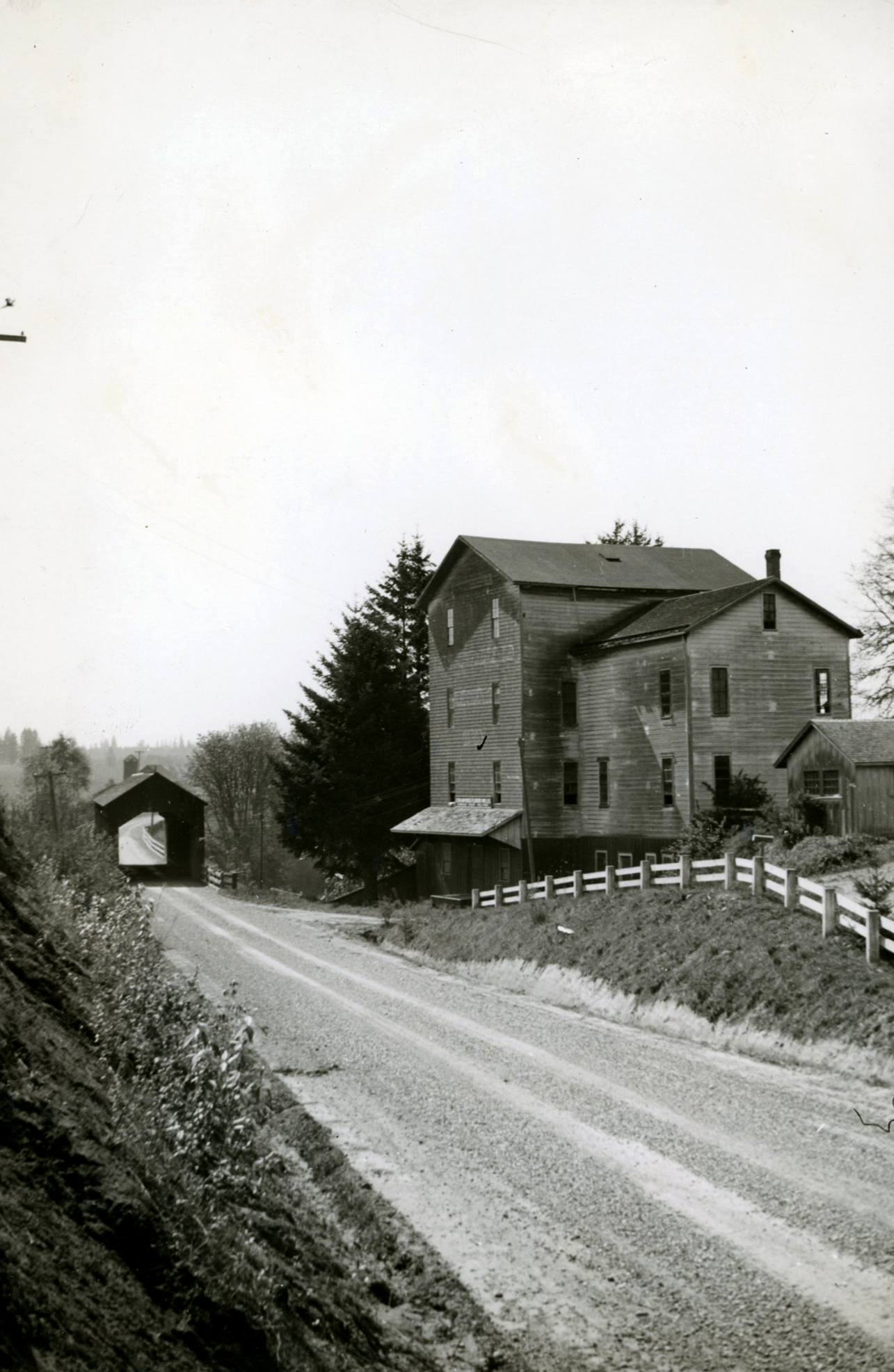 Champoeg Mill and covered bridge across Champoeg Creek, 1939.