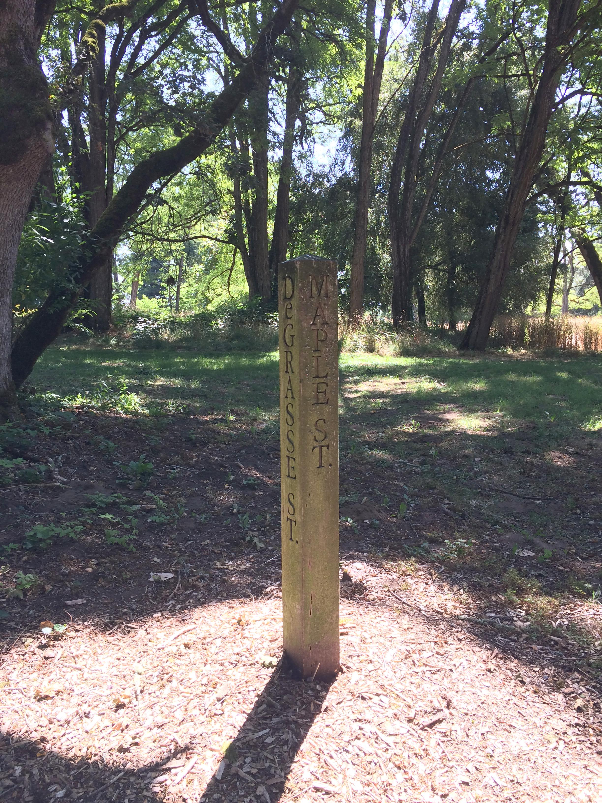 Sign marking the former Maple and Degrasse Streets in Champoeg, Oregon, 2016.