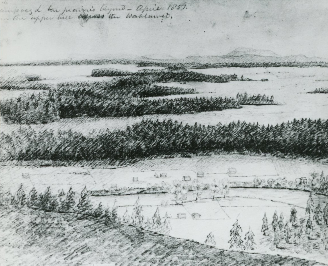 Pencil sketch of Champoeg by ethnologist George Gibbs, 1851.