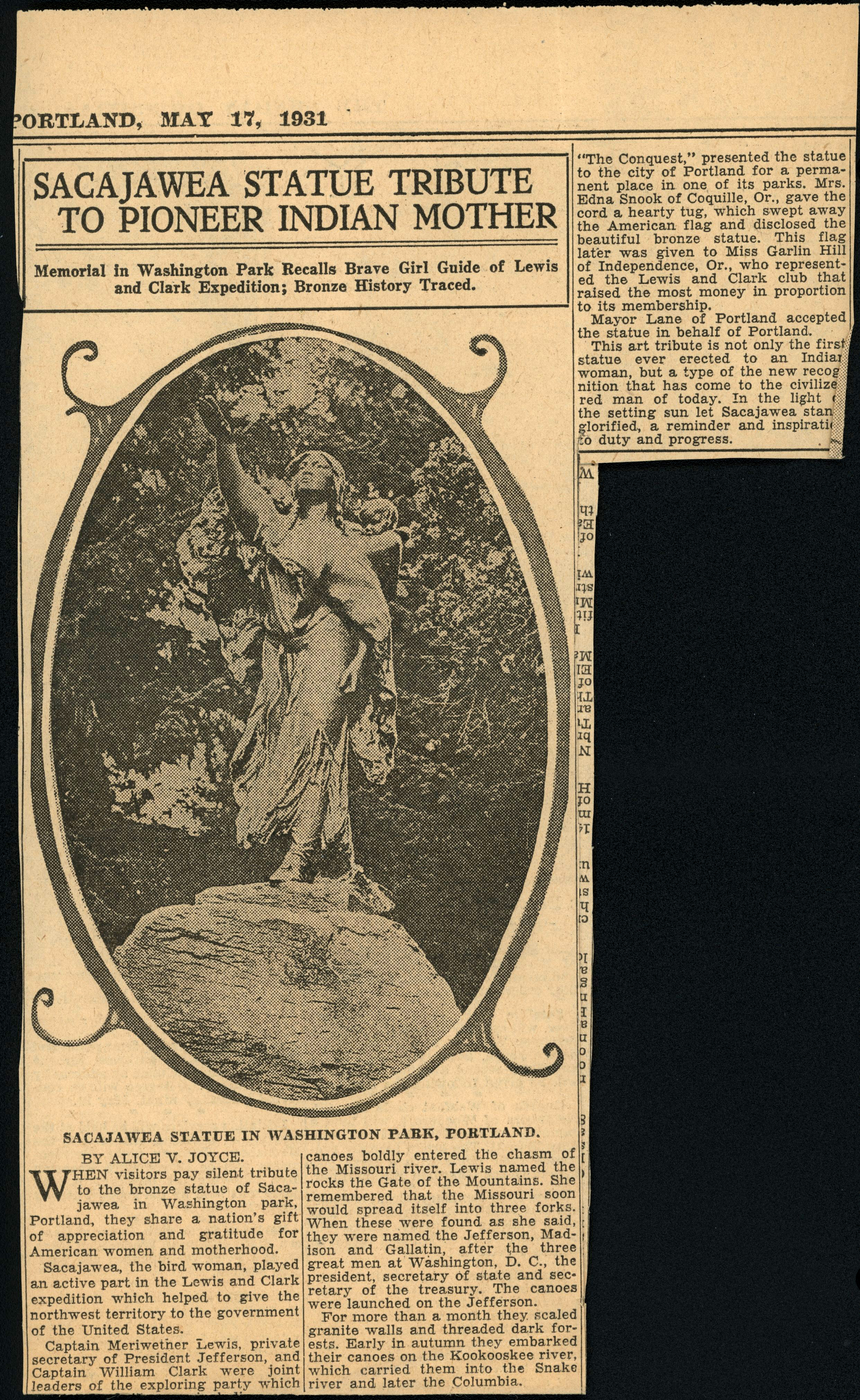 Sunday Oregonian, 1931, article on Sacagawea and Pomp statue in Washington Park, Portland.
