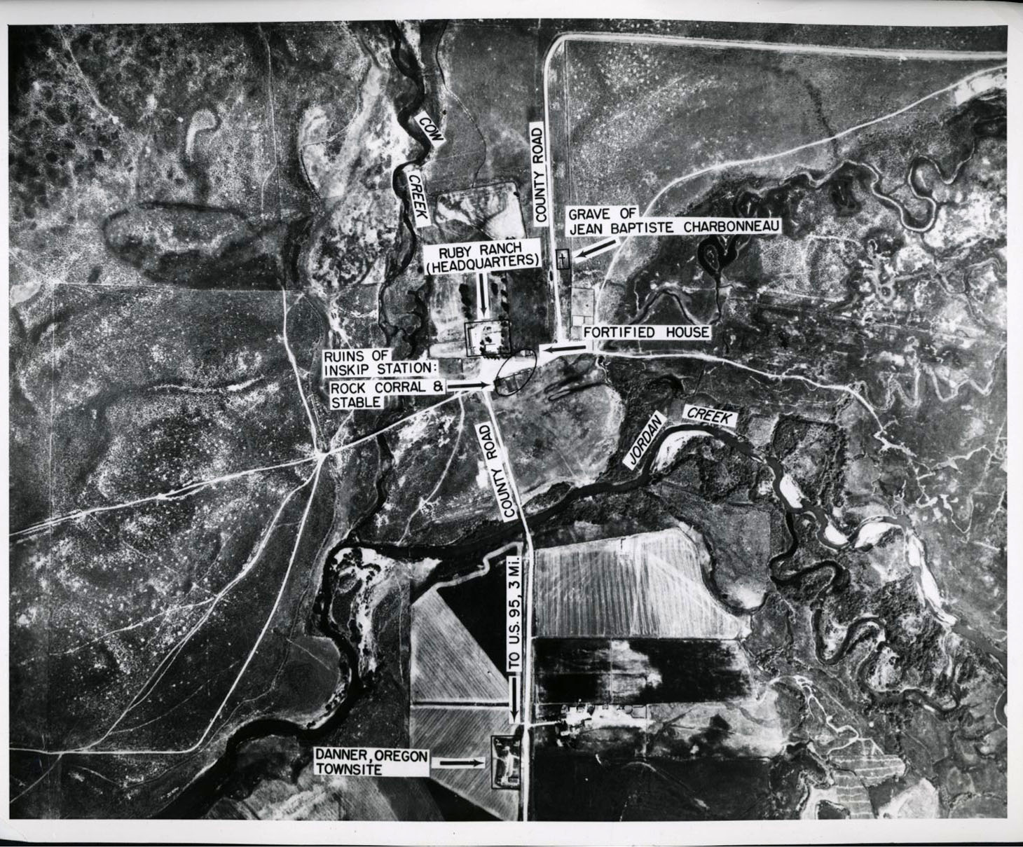 Aerial photo of Danner, Oregon, showing Pomp's grave site, 1963.