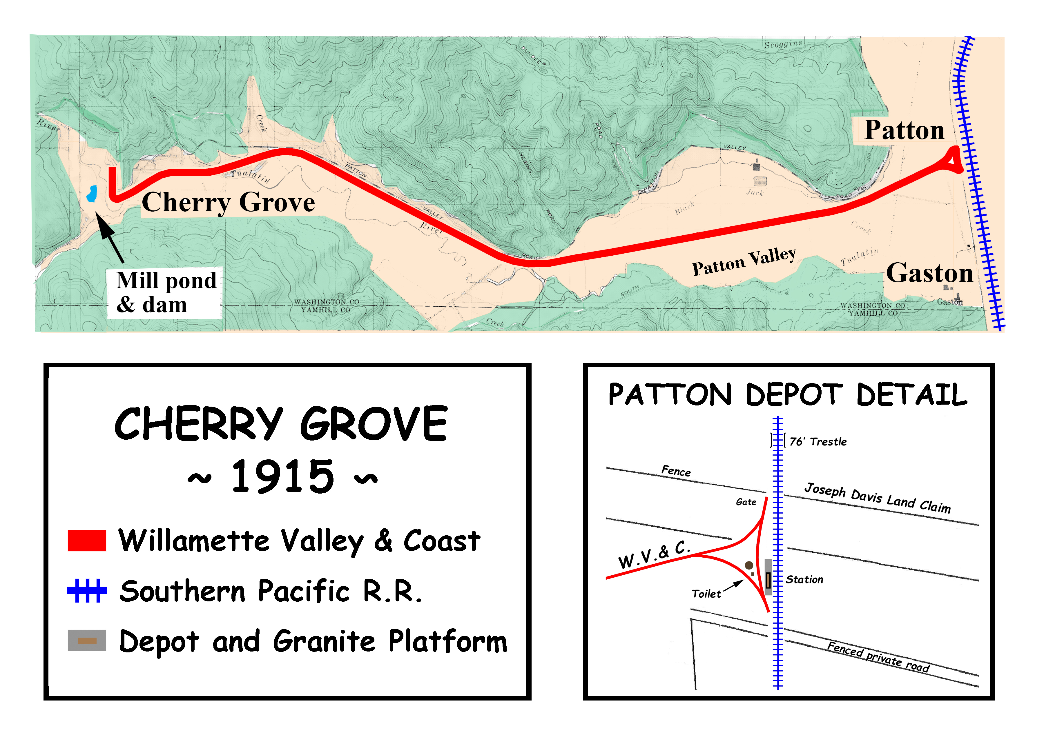 The mill and its railroad were the brainchild of August Lovegren, a Swedish immigrant who arrived in the Patton Valley, eleven miles south of Forest Grove, in 1910. On January 17, 1911, Lovegren and his sons Phillip and Levi incorporated the Willamette Valley and Coast Railroad to serve the Lovegren Lumber Company. The railroad would become a common carrier, transporting passengers, as well as lumber, agricultural products, and mail over a 5.8-mile line between Cherry Grove and Patton Junction, where it connected with the Southern Pacific Railroad.