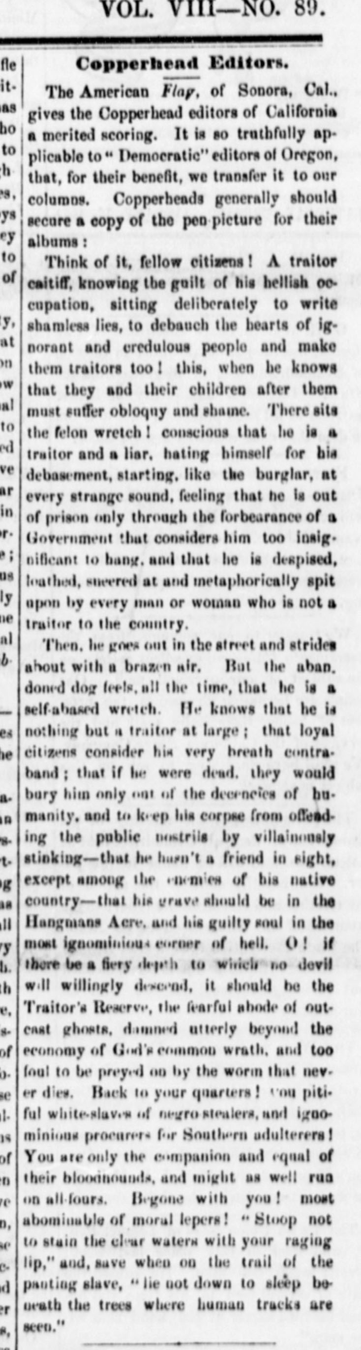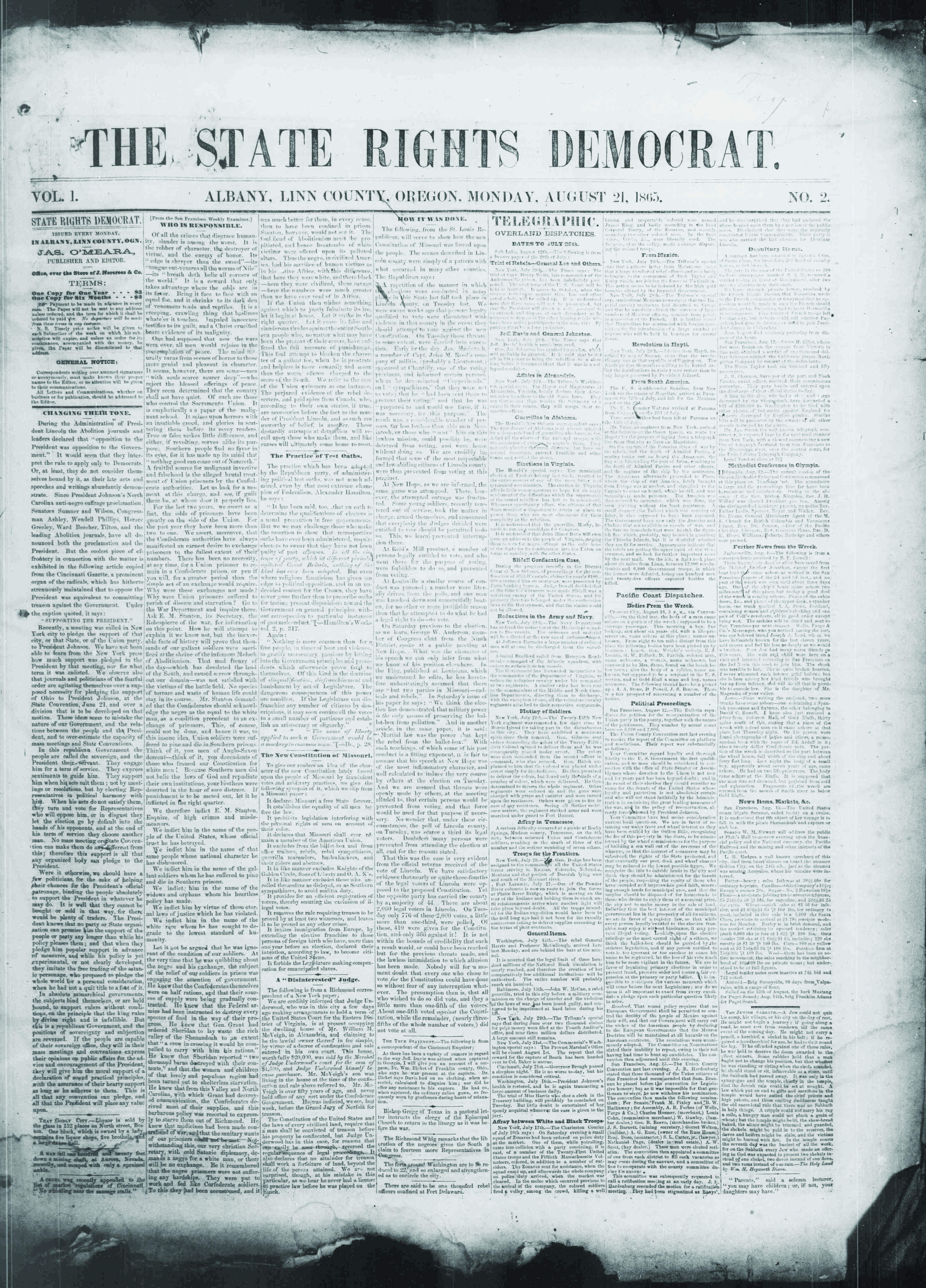 Oregon's pioneer newspapers were also political organs, advancing their cause in news articles as well as editorials. The most prominent advocates were Asahel Bush of the Oregon Statesman (Salem) and T.J. Dryer of the Oregonian (Portland), Democrat and Whig, respectively. But as the nation entered the Civil War and demands for suppression of "traitors" appeared in the North, it was the editors at smaller weekly papers in Oregon and California who would pay for their outspoken views.