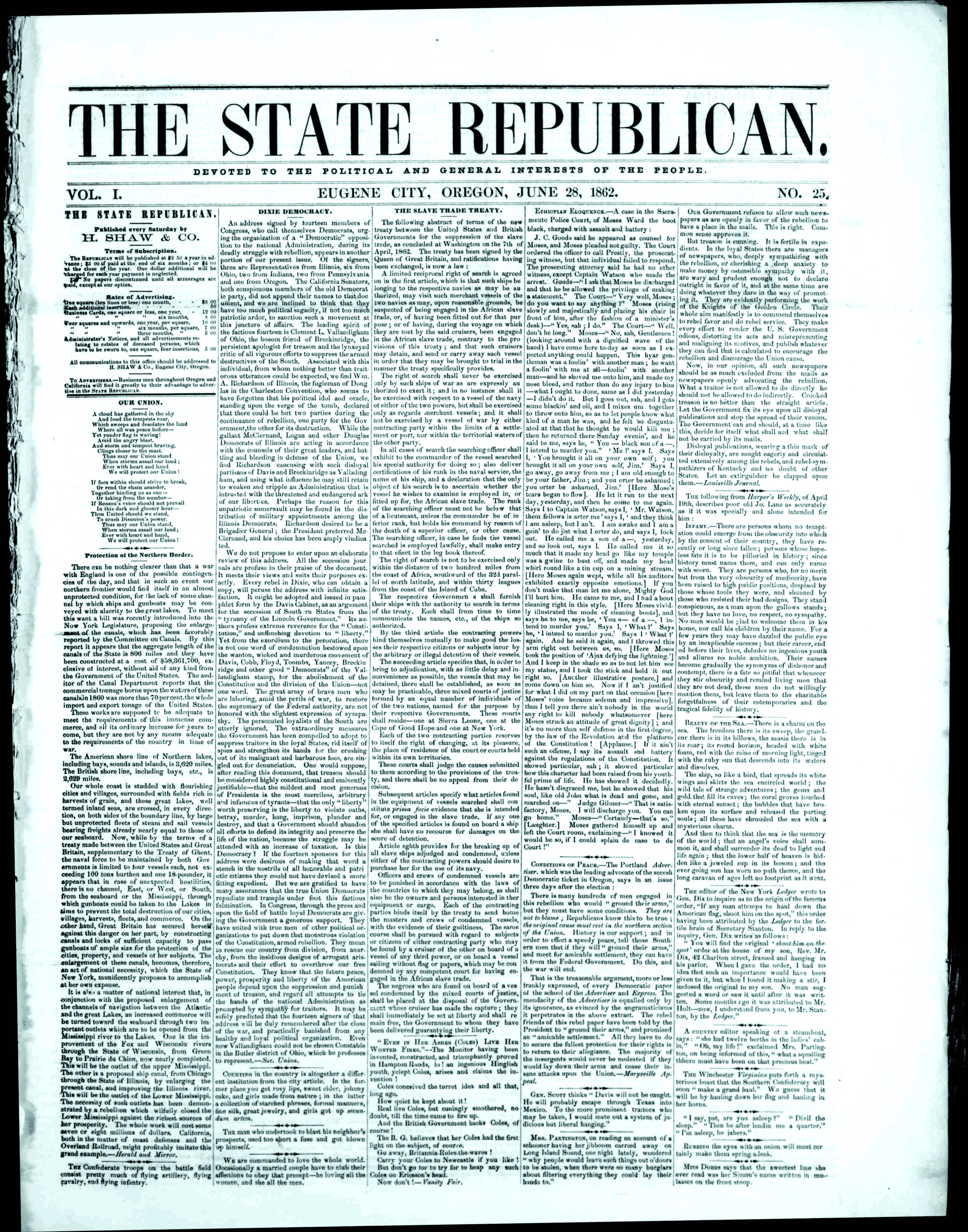 Clip from The State Republican, Eugene City, June 28, 1862.
