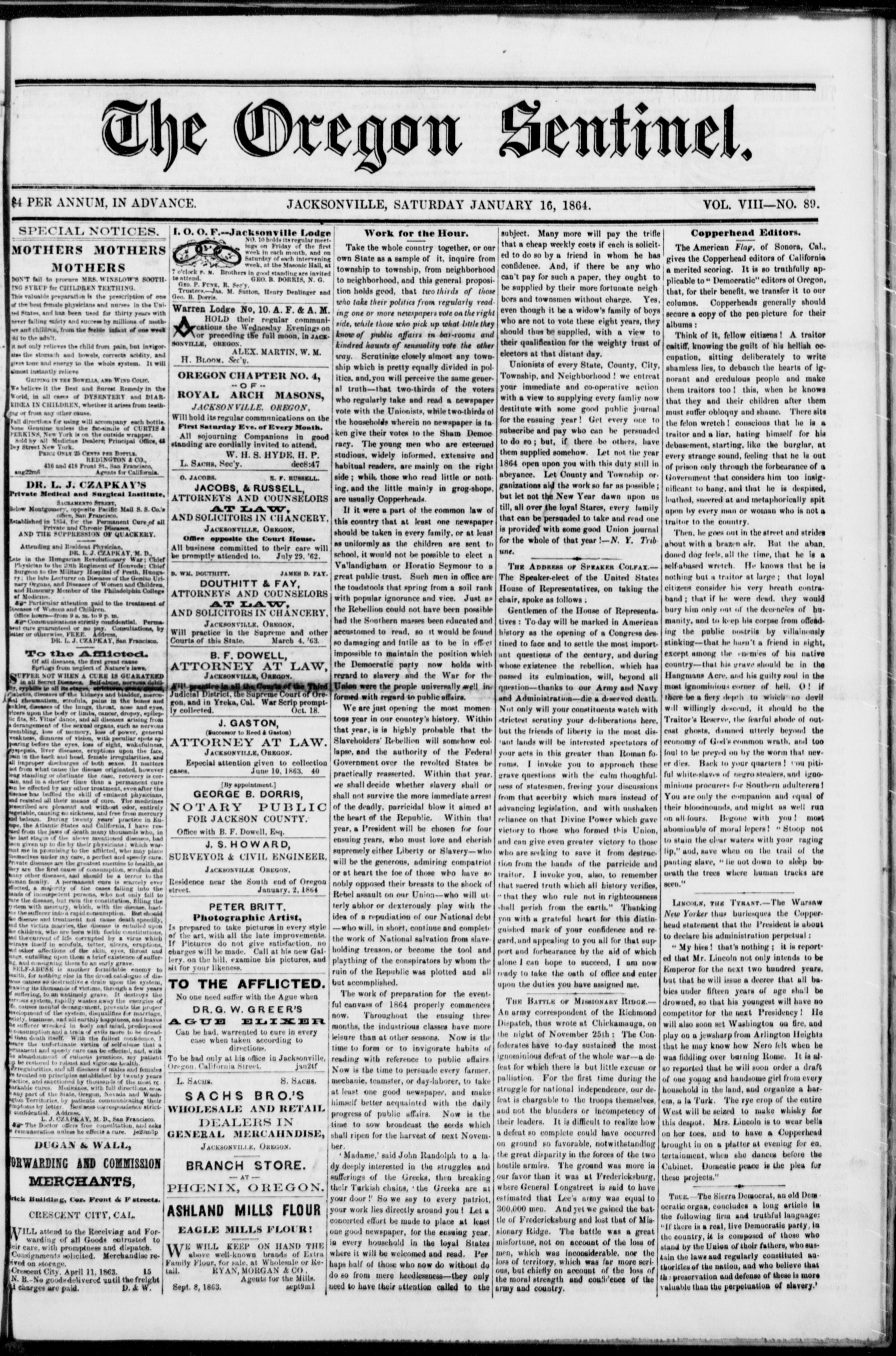 Oregon Sentinel, Jacksonville, January 16, 1864.