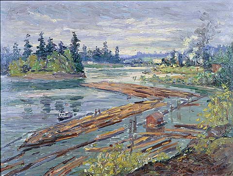 Oil painting, "Log Booms in Willamette River and Blast Furnace on West Bank," by Clyde Keller, 1916.