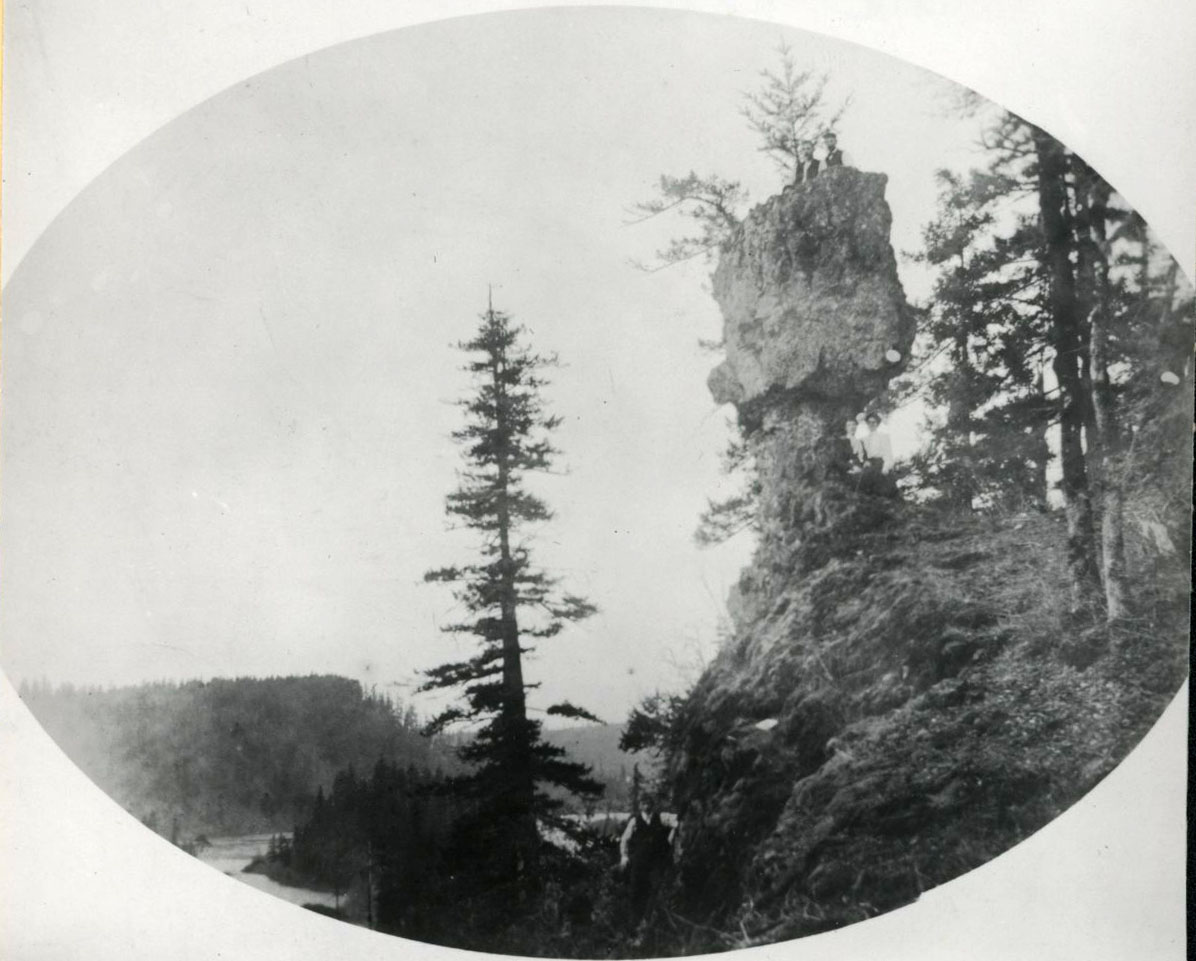 The earliest reference to the name Coalcas Pillar appears in the Oregon City Enterprise in 1897, where it is rendered as Coolca’s Pillar. The article relates what it calls a “romantic and pathetic” legend of Coolca, a Molalla chief who loved Nawalla, the daughter of Chelko, a Clackamas chief. Rejected by both Nawalla and her father, Coolca kidnaps the girl, but she dies of a broken heart. Chelko and his warriors drive Coolca from the top of the bluff, and the pillar remains as a reminder of the events. Two other versions of the legend appear in Vera Martin Lynch’s Free Land for Free Men: A Story of Clackamas County (1973).