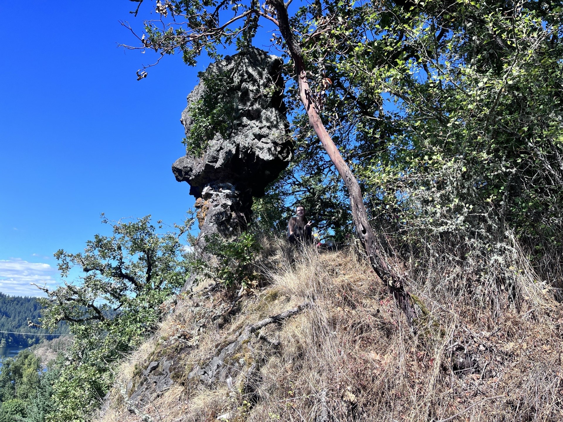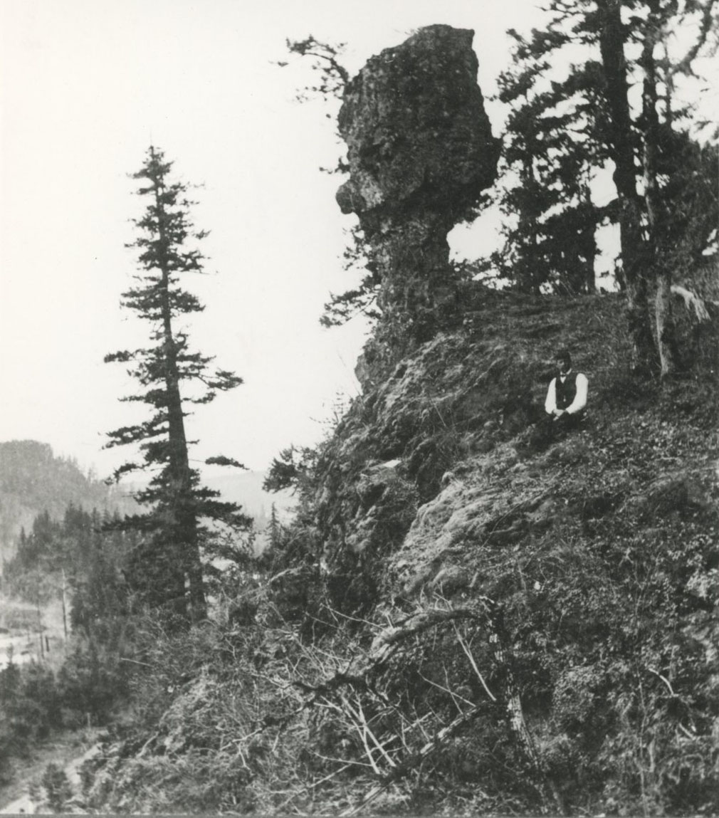 Coalcas Pillar became a popular destination for hikers. From the 1910s into the 1950s, the Mazamas, a local climbing and hiking club, frequently arranged day trips from Portland to Canemah by interurban train and then hiked to the pillar. Like a number of other distinctive basalt formations in Oregon, Coalca’s Pillar was a popular subject for postcard views in the early twentieth century.