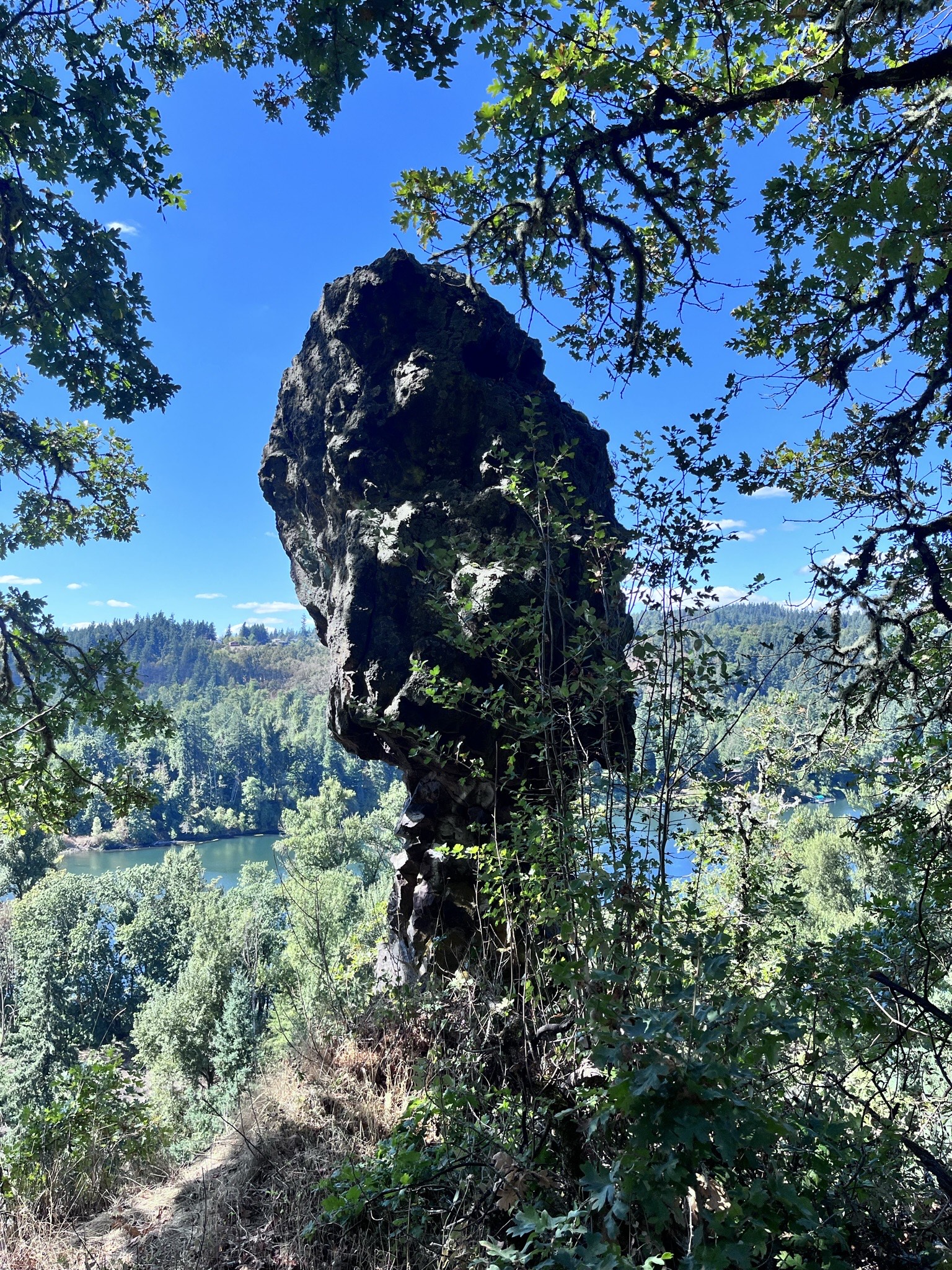 Coalcas Pillar is a rock formation—an eroded basalt plug—located on a bluff overlooking the Willamette River about five miles south of Oregon City. Somewhat mushroom-shaped, about thirty feet in height, and often inaccurately described as a “balancing rock,” the pillar has long been a landmark for travelers along the river. It is visible from the railroad and from Oregon Route 99E, although it is now often screened by foliage. There is currently no public access to the pillar, which is on land owned by the Oregon Department of Transportation.