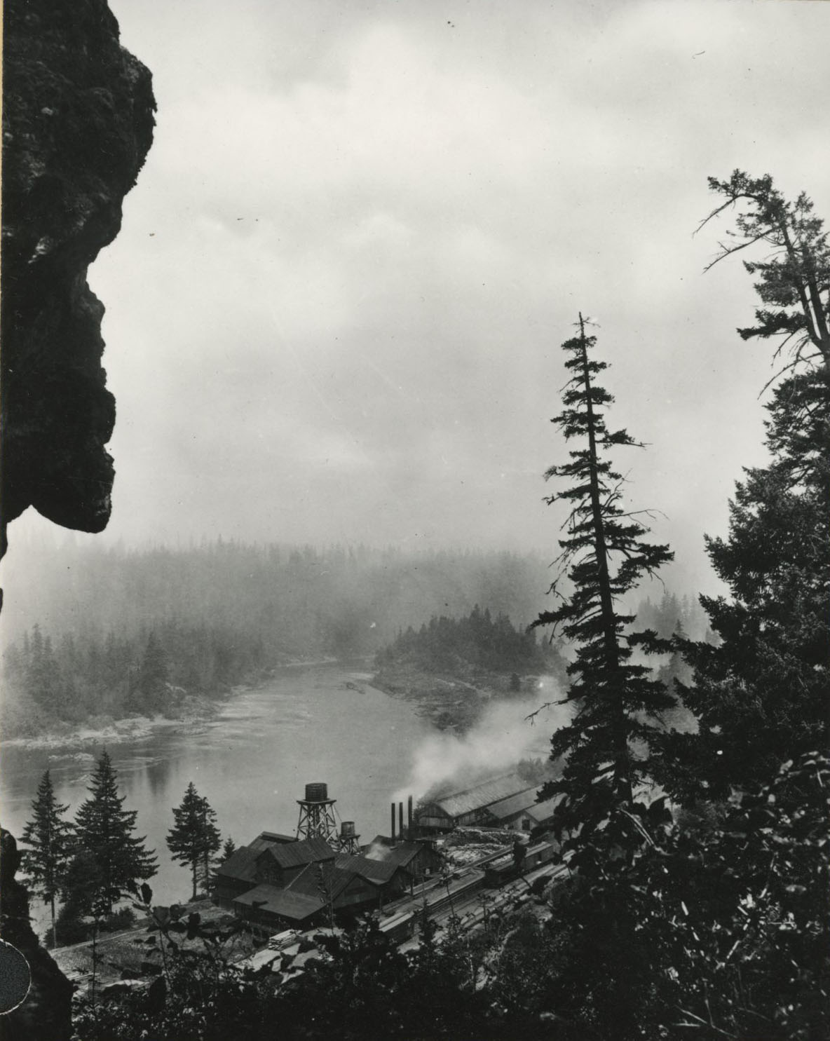 Lumber mill at Southern Pacific's Coaca station, Willamette River; Coalcas Pillar on the left.