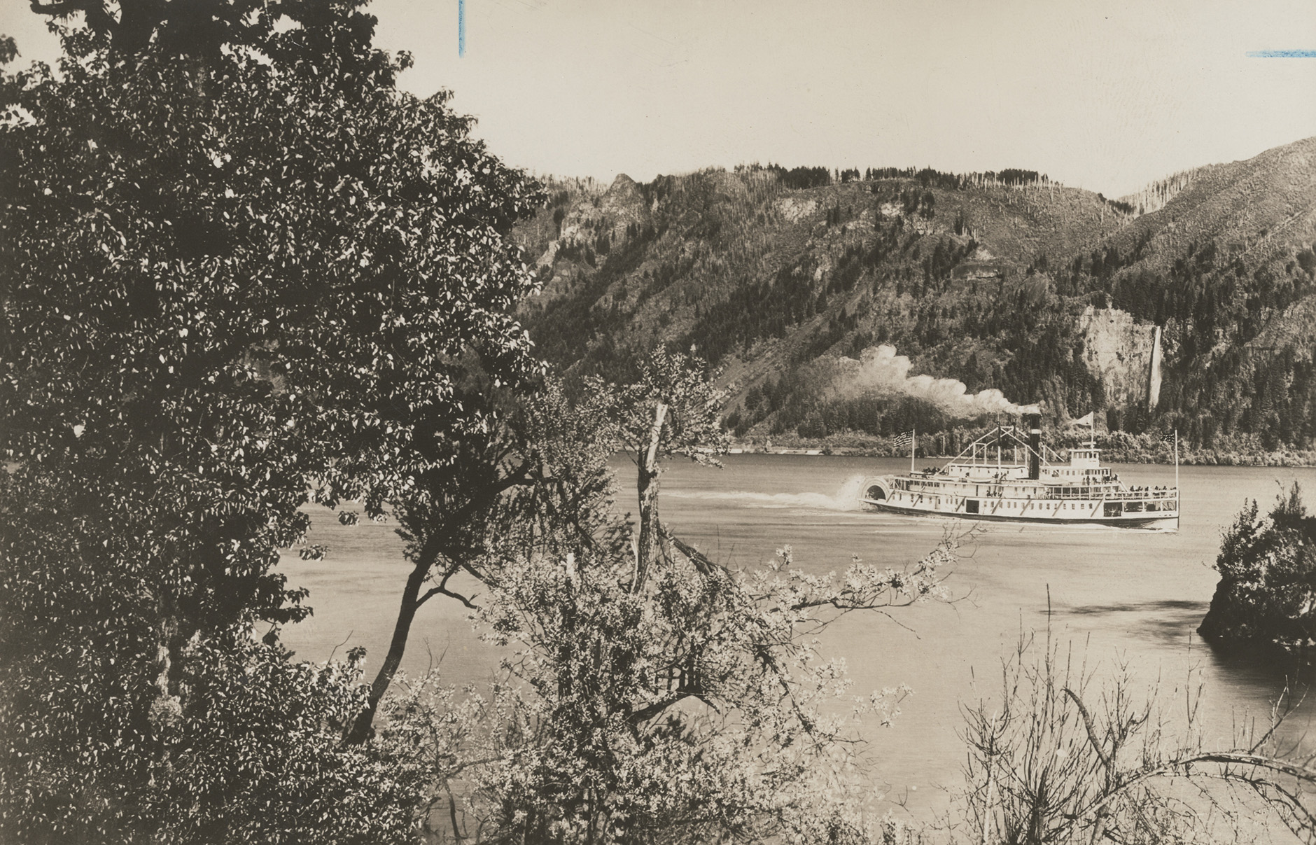 Photography played an important role in shaping perceptions of the Gorge. Carleton Watkins arrived from California in 1867, traveling by steamboat to photograph both the landscape and the human imprint with his cumbersome equipment. He returned in the early 1880s to make a new series of images. At the start of the twentieth century, Lily White and her friend Sarah Ladd cruised the river on White's eighty-foot houseboat, taking photographs of its towering cliffs, some of which appeared in Ladd's 1904 book Columbia River Scenery.