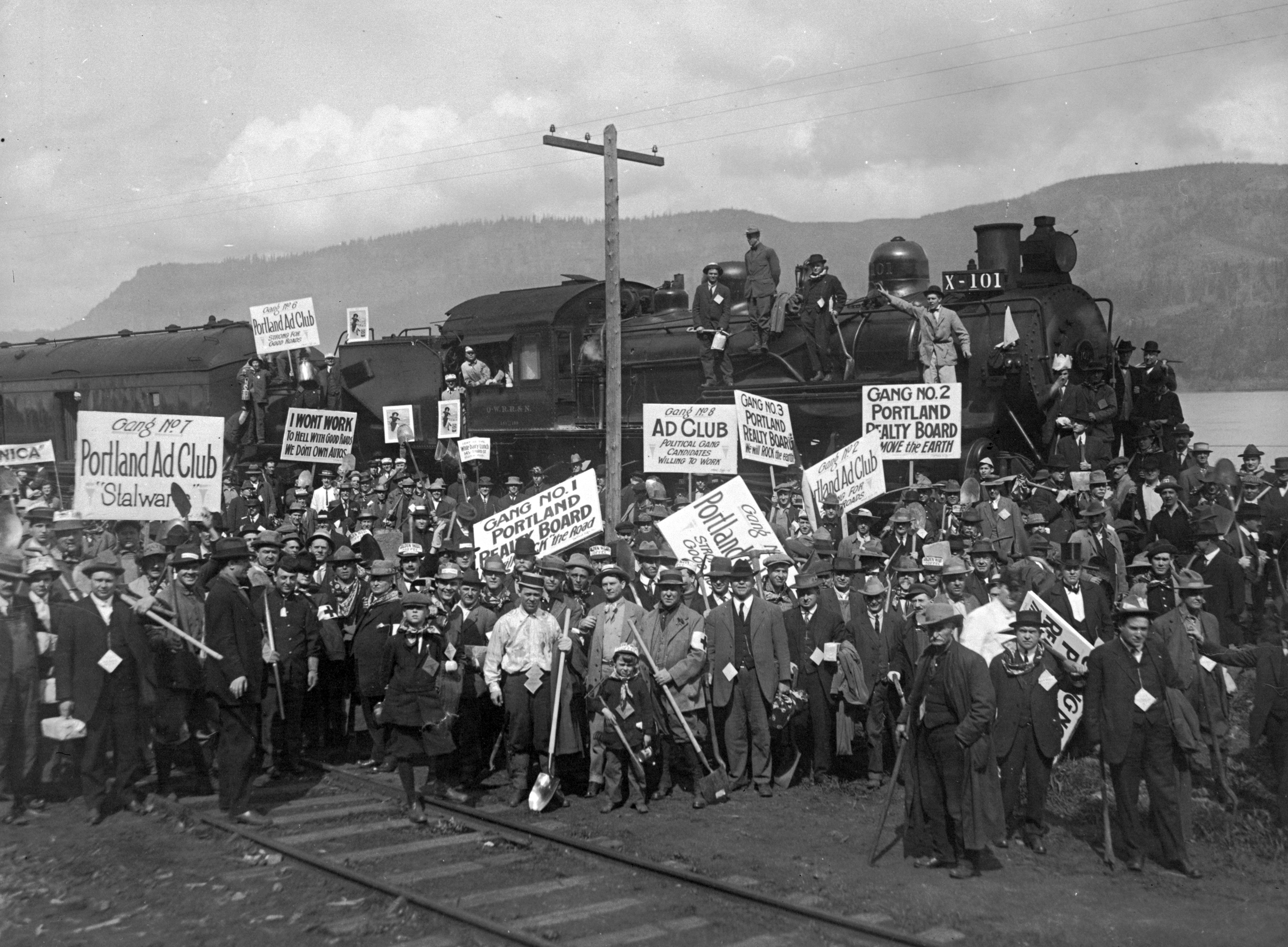Road workers protest on Columbia River Highway, April 25, 1914.