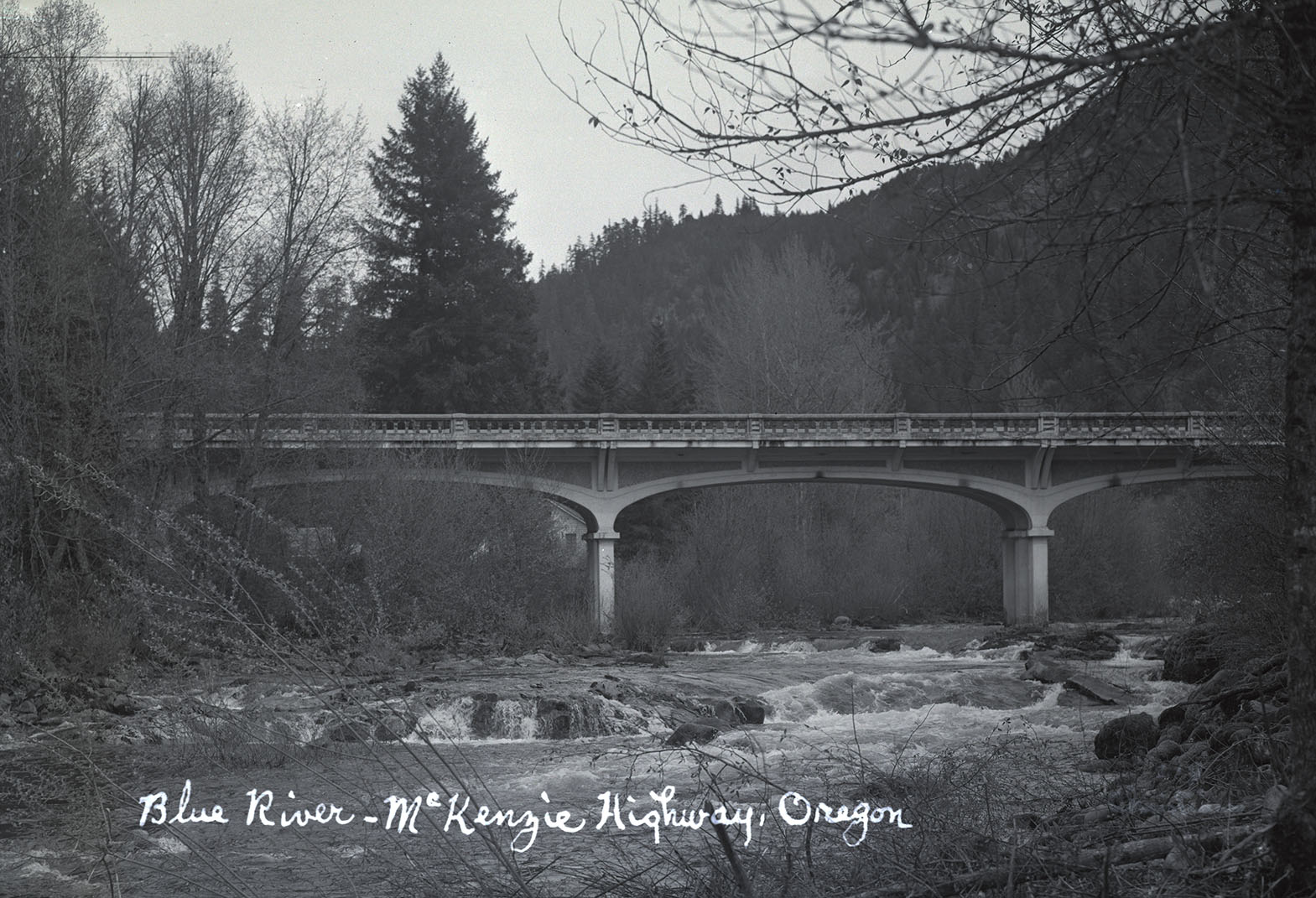 A covered bridge spanned the Blue River at the northern edge of town, serving as a collection station for the McKenzie Toll Road between Springfield and central Oregon from 1891 to 1895.The bridge washed out and was replaced in 1909. The new bridge also washed away in high water and was replaced by a concrete bridge in 1928.