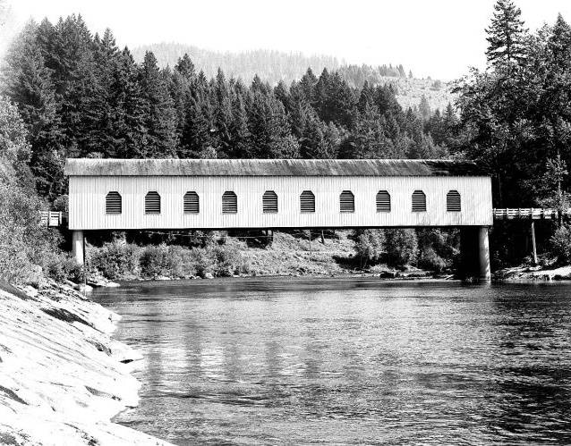 Goodpasture covered bridge over the McKenzie River in Lane County, Oregon, 1946-1957.