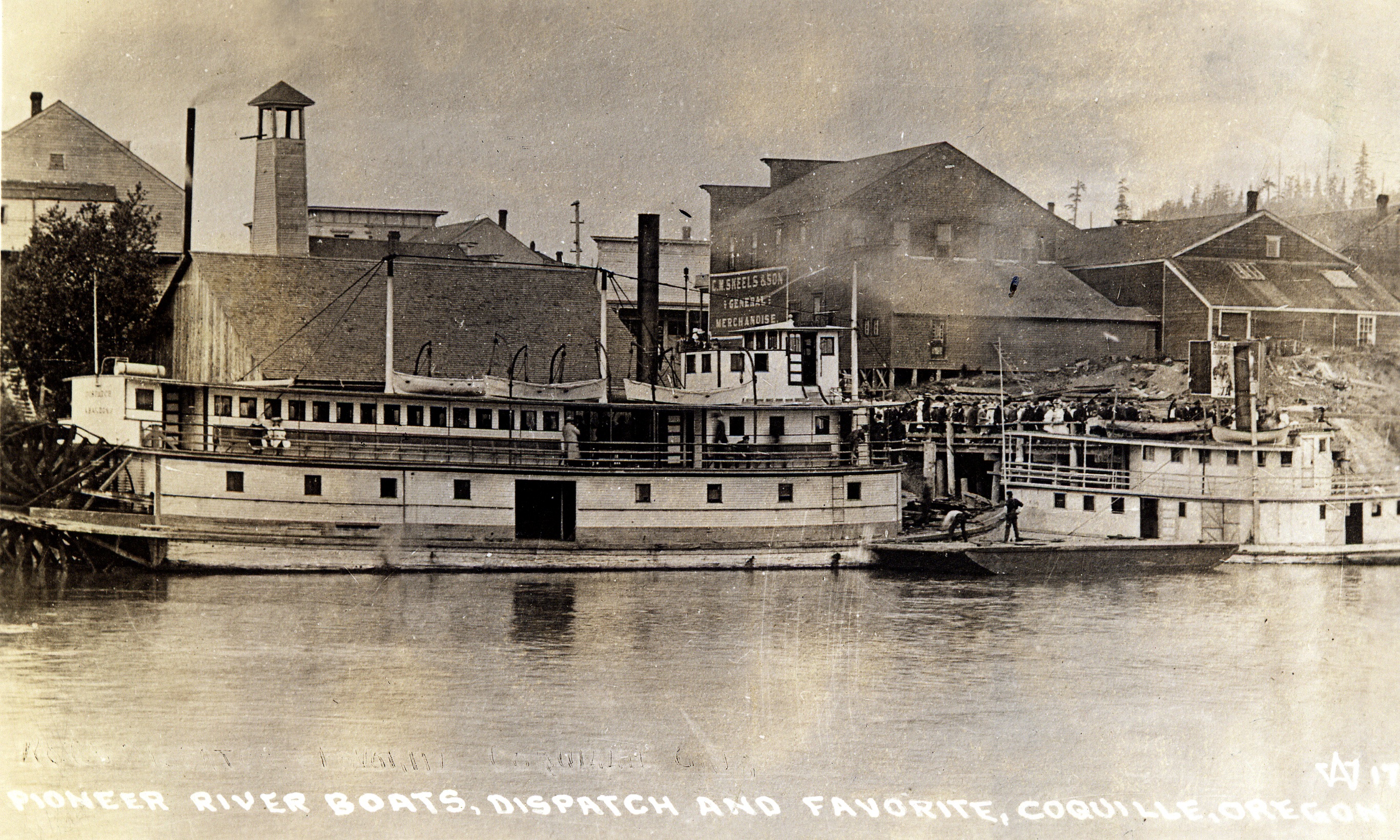 Riverboats Dispatch and Favorite at the Coquille waterfront, c. 1910. Courtesy Coquille Valley Museum